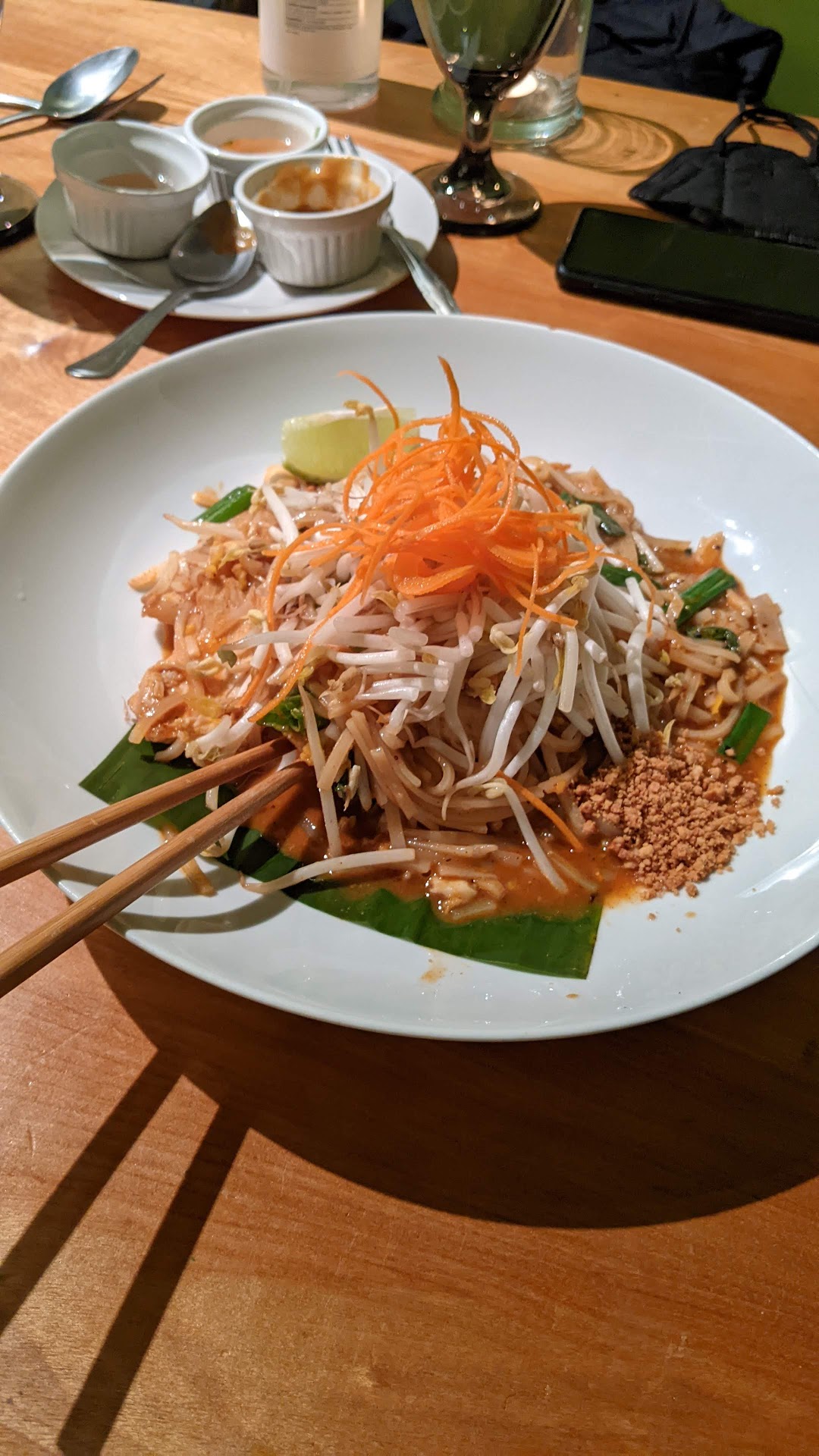 I ordered the Singapore noodles. It's a wide noodle dish with some curry seasoning and accoutrements. It said that it came with shrimp. The dish was flavorful. The presentation was great. The shrimp were huge! They were borderline langoustines. Piping hot. I asked for crushed red pepper on the side. The pepper burned! Excellent heat to flavor ratio.