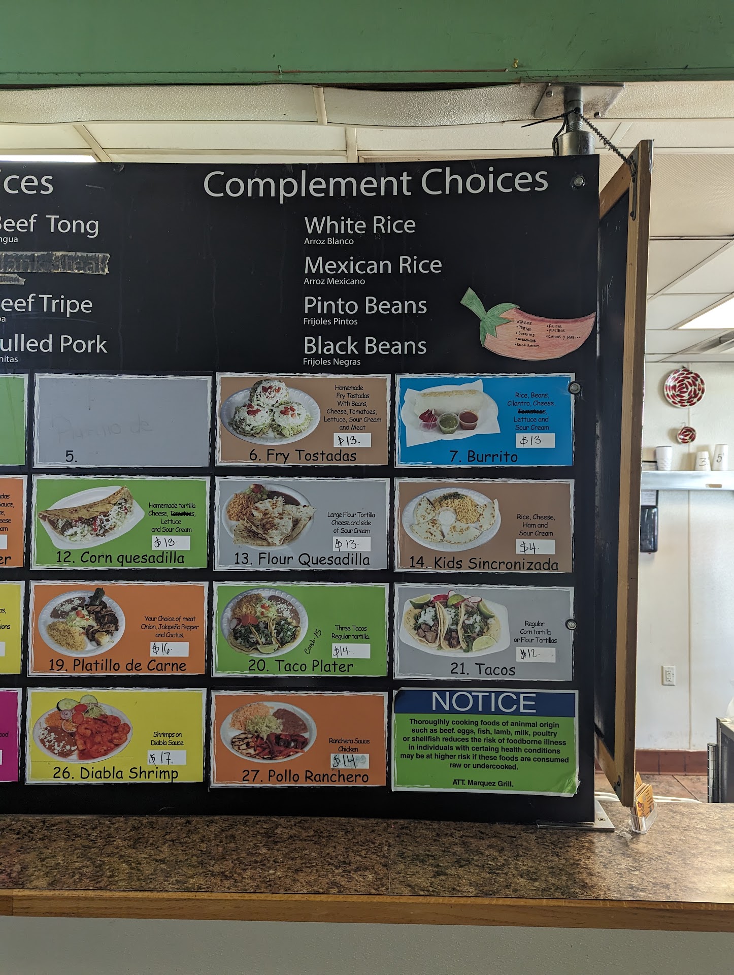 Read moreToday was my 2nd lunch at Marquez and will be going back again. There is enough variety even though there is not page after page in the menu. In fact the menu are numbered photos of the various dishes on the wall. This suited me just find being as I don't speak Spanish and all I needed was the number and then choose from the many meats to go with the dish. the condiment bar had 3 fresh salsas, onions & fresh chopped cilantro. We both will...