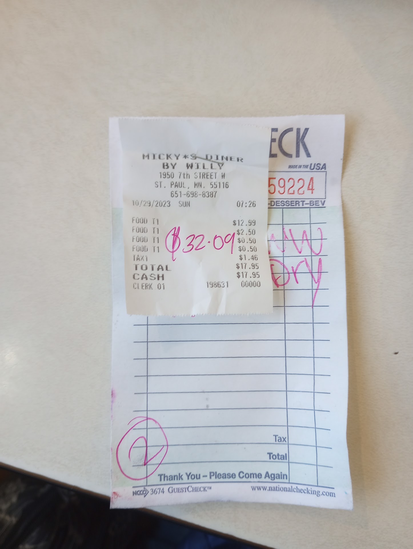 a friend and I came to this restaurant one evening thinking it was as good as the original micky's, I wanted it to be good, and it wasn't. wasn't busy at all, I see why now. we sat in the parking lot looking into the restaurant. The waitress was sitting at a table. once we got into the restaurant, we sat down at a table and saw that it was dirty and had ketchup everywhere, even on the menus. the waitress heard us talking about it and then came to wipe it off, saying that it happened because she was cleaning the ketchup bottle and it spilled ,lies !. we watched her sitting at a table before we came in. she gave us both water and one straw, then she left and never came back, the guy behind the counter had to come to take our order, who was not friendly at all. after receiving our food, we noticed the hashbrowns looked like mashed potatoes, and a thin patty of meat with two slices of cheese on toast that was supposed to be the patty melt was brought out to us, not the waitress or the person that took our order but by the Cook. we ate as much as we could, and then we waited for the check and was told that we had the come the register to pay, we looked up and saw hundreds of flies in each of the light figures all over the restaurant. i got a little sick seeing that. I guess it doesn't take much to please people these days by looking at the reviews, lol. and two guys behind the counter spoke to each other in another language but we didn't think anything of it but while in the parking lot leaving a young lady said that she knows the language from traveling and that they weren't saying rude things about us. we'll never eat there again, and I'll tell everyone I know never to eat at that place. The original micky's was great with friendly service and great food clean with positive vibes. I don't know who micky's by Willy is, but he needs to sell...