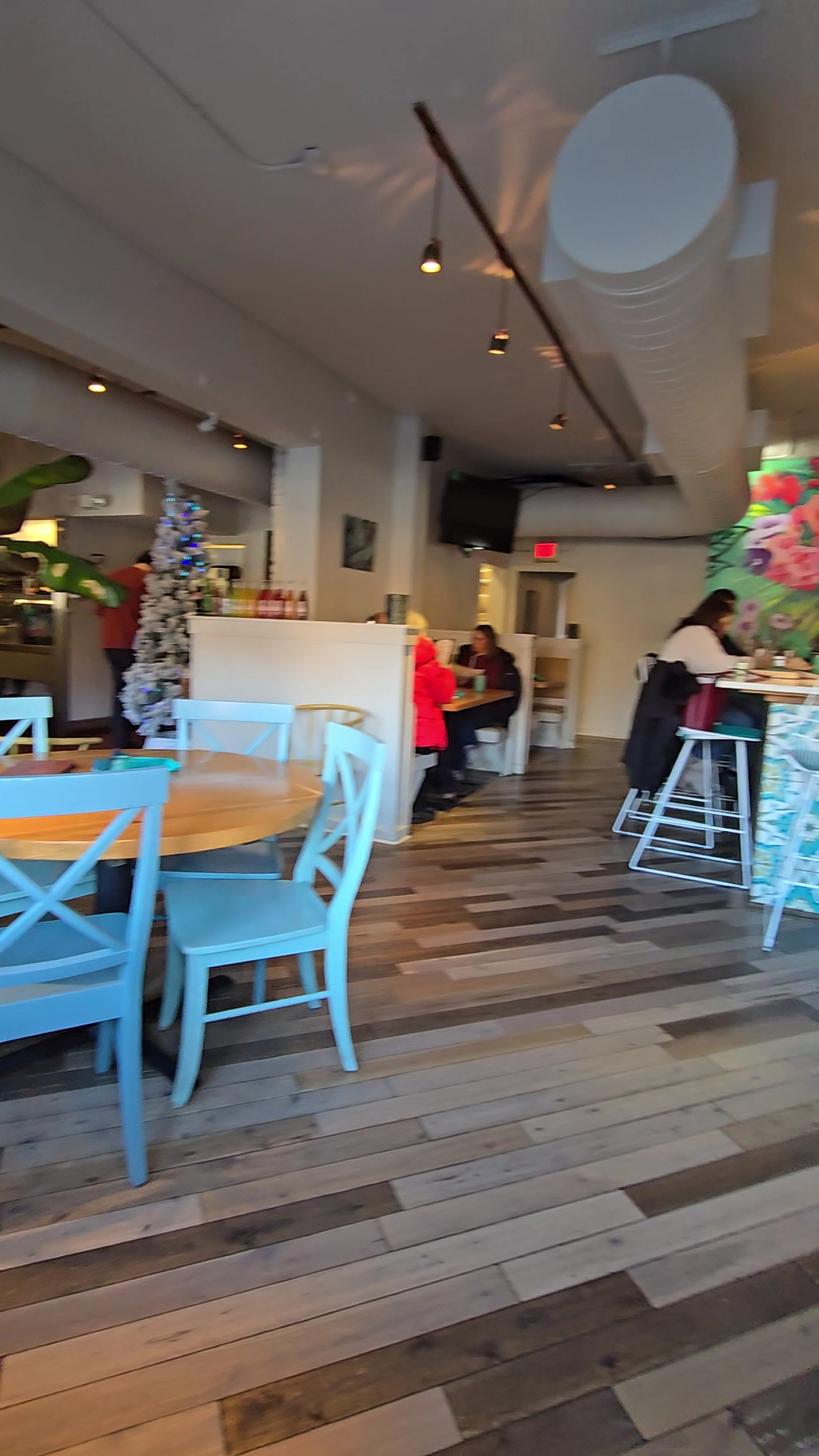Our friends arrived, and we sat at our table. We got their house made chips with a flight of salsas...I loved the roasted corn one but all were good. Of course I ordered the birria tacos - you get three complete with consume and radishes, onions, etc. These really are delicious. They are made with lamb, and it was tender and juicy. My husband and our friends got a mix of tacos. I liked the pescado and pescado asado tacos, but they needed a bit more salt and a bit more topping. The mushroom one was interesting, but rather bland. The single tacos range from $4-5, so it is very affordable. I also had their horchata, which was a very nice version of this classic rice and cinnamon drink. It was not overly sweet, which was very nice!