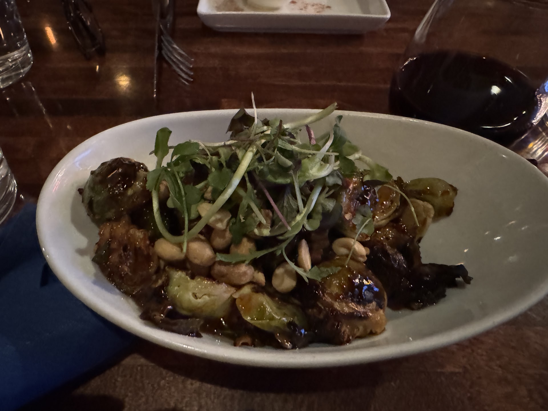 The brussels sprouts come with a Kung Pao chili sauce, which was heavily soy sauce-y and a bit spicier than I like (even with a good spice tolerance for a very pale Minnesotan, lol.) They had a delicious smokiness, but the micro greens on top were unnecessary. The peanuts are a lovely touch. Iād get them again for sure.