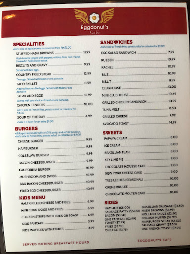 They do now have an extensive breakfast menu that includes lots of egg options (eggdonuts, omelets, Benedict’s, pancakes, extras) as well as lunch options with sandwiches, burgers, specialties, AND an impressive dessert menu :)