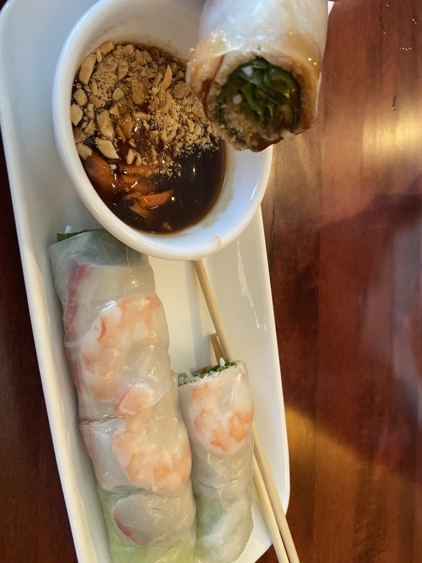 For appetizers, we ordered the spicy wings and shrimp mini egg rolls, which turned out to be the best part of our visit. Both were flavorful and well-prepared, which initially gave us hope for the rest of our meal.