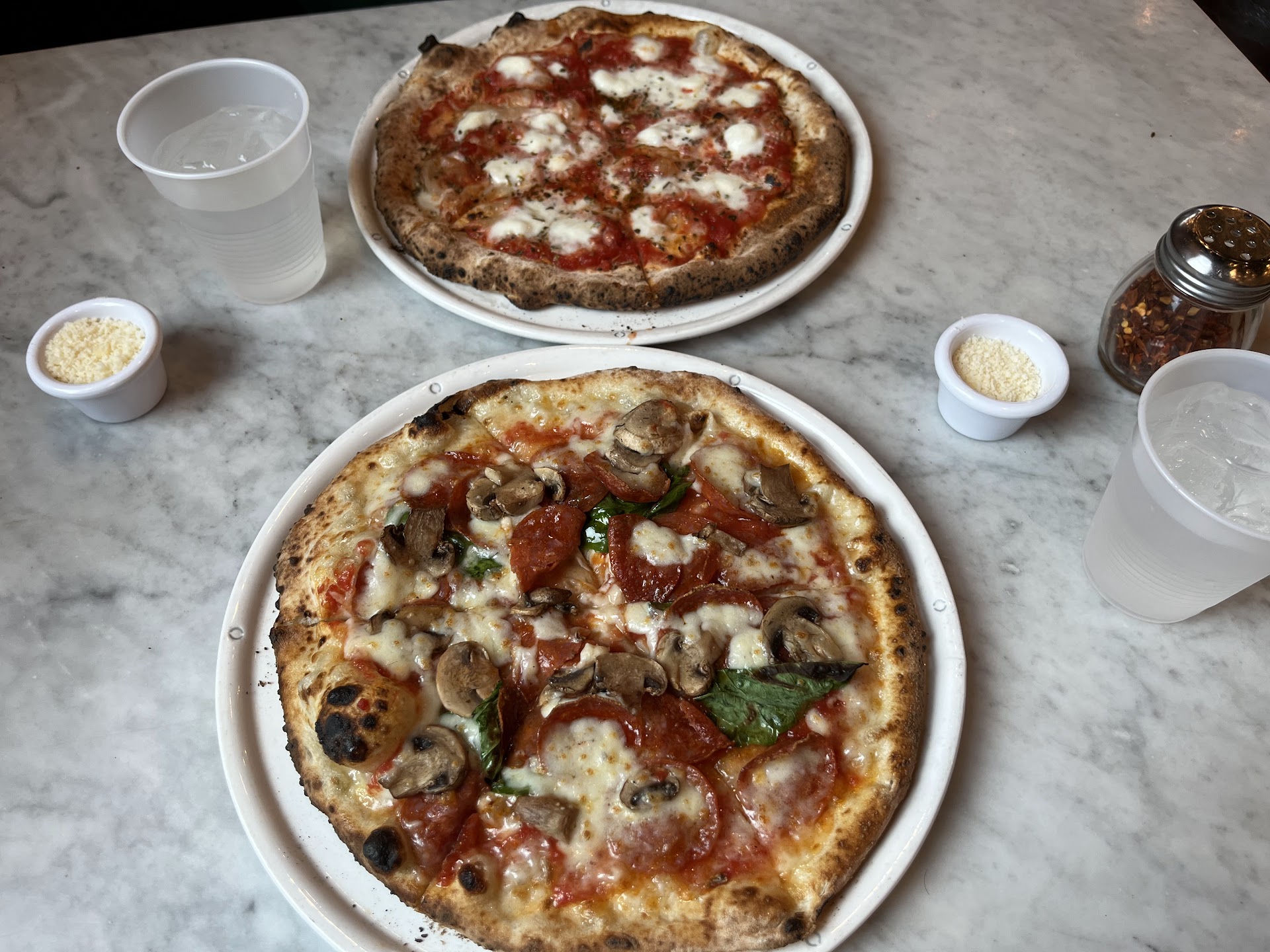 How good it was: 4 We got the Bruni and Toto pizzas. The Bruni had Sausage, spiced salami, onion, oregano and the Toto had Prosciutto, arugula, goat cheese, cracked red pepper, garlic. The Bruni was flamboyant, every bite was a satisfying flavor explosion. Unfortunately the middle did seem slightly undercooked but overall a great choice. The Toto had a nice balance to each bite. The Prosciutto and Garlic was not overwhelming and had a nice greeny appearance helped of course by the arugula. The Toto is a pizza for those who are a tad adventurous and are willing to try new flavors. Both crusts had a nice and salty charred tastes to them adding to the depth of each pizza's flavor.