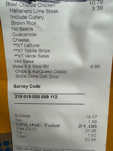 Read moreWhen we arrived at 5pm on a Wednesday, the restaurant was completely empty. The only staff we could see was a girl standing behind the line on her phone. When we came up to order, she visibly looked annoyed that we were there, took a ton of time to put on her gloves, and then just stared at us. There was no greeting or acknowledgment of taking our order. The whole process of ordering with her was unfriendly and rude. She was flicking the scoops of our food into our bowl like we were her personal dread. She missed the flick of guac and it went half off the bowl, and she just pushed it back in with her finger. A bunch of items were also missing from the food line when we got there, even though it was an empty restaurant. When I got to the checkout and said I needed chips and queso, she literally rolled her eyes and looked so annoyed I asked. She asked what size, I clearly said Medium and that is what I received. After I put my card in to pay, she just started to walk away and did not acknowledge the transaction was done or give me a receipt or anything. I was still standing there because I didn’t know if the payment was good to go, and she looked back at me all confused why I was still there. I asked for the receipt and she seemed really weird about giving it to me. I took it and we brought the food home. When I got home, I realized that I was charged for a Large chips/queso. It really seems like this was an intentional over charge due to her entire demeanor and her reluctance to give me my receipt. Highly highly...