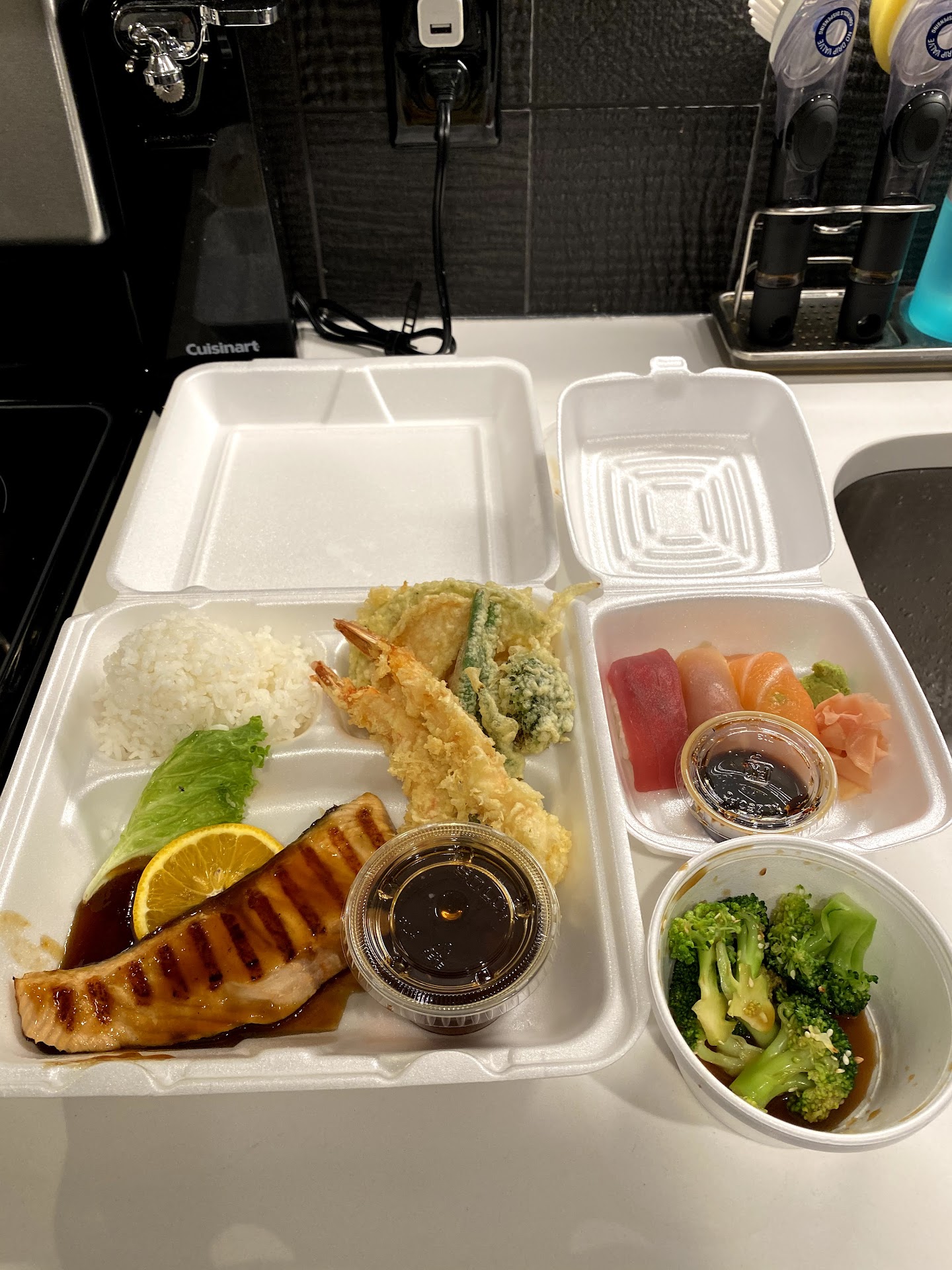 Read moreI went when it was not busy, right at the opening of the resturant's day. Ordered green tea- the waiter came, heavily plopped it on the table just out of reach for me on the far end of the table. Not only that, it came in a greasy cup. I ordered the Combination Bento Veggie/Shrimp tempura. The starter was a broth soup- which the broth was good (a bit light, clear) but the mushroom slices in it were too fresh flavored, and not savory at all. They were not traditional mushrooms for this soup as they were most definitely the slices of white button mushrooms. The waiter once again plopped it down on the table just out of reach for me (what's up with the heavy hand and not putting the food in front of me?). It looked good at first- but soon I realized that I never received the veggie tempura part of my meal. The seafood tempura I had been given was battered in a non-traditional batter- more like an onion ring than the delicate tempura I enjoy. It was average flavor, nothing to write home about. The side salad was literally the same as what you get out of a bag at the supermarket- iceberg lettuce with a few scrapes of carrots and cabbage in it. The side chicken was in a sweet sauce that was absolutely bottled and pre-made. There was nothing to write home about this meal except my disappointment in both the food and the heavy handed service. I was made to feel unwelcome as one of the first customers arriving that day through underhanded service and food. I do not recommend spending...