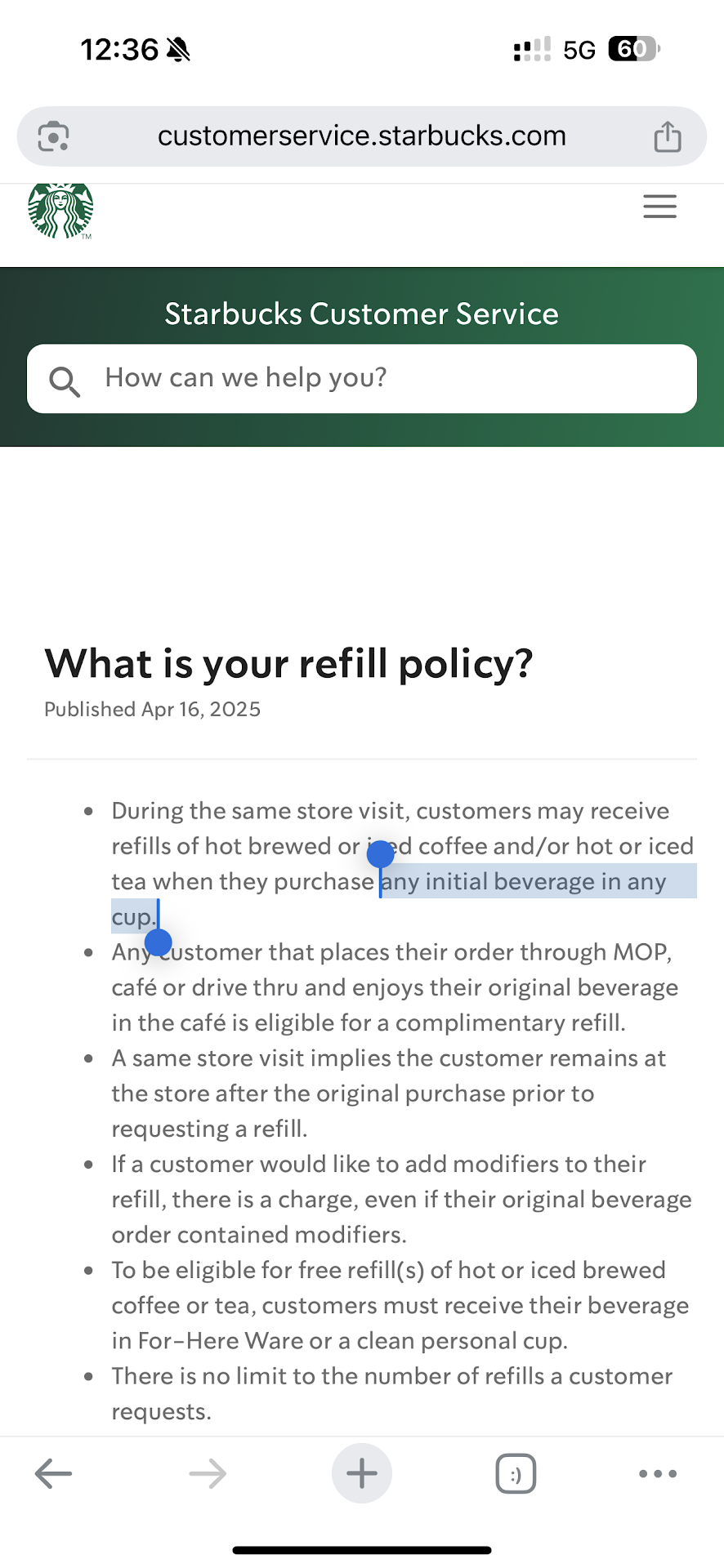 When I ordered a handcrafted beverage in a personal cup, I asked for a refill of hot coffee an hour later while staying in the store. The barista, Yecenia, told me that they donât do refills of hot coffee unless I ordered a hot coffee to start with. I mentioned that most Starbucks do refills of hot coffee with any initial beverage purchase. She said âyou can look it up online.â I found where on the Starbucks support website it shows that refills are allowed regardless of original beverage purchased and she said âwell weâre a franchise store so we donât do that. And we only do hot refills and not cold refills.â