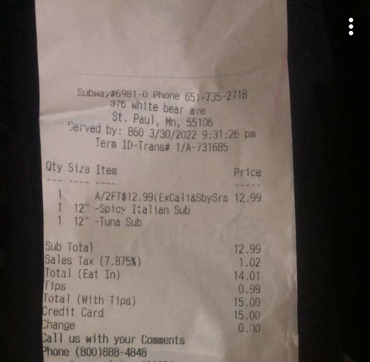 Read moreThis Subway is filthy. Stood in line for approximately 15 minutes waiting to order. It was dinnertime and busy, so I could understand the wait. Fortunately, that gave me time to really view my surroundings. First, a teenager in line sneezed over the potato chip section at the counter and didn't bother to try to contain it. Yuck! Okay, so no potato chips for me. Then, as I moved up in line, I was able to see behind the counter. The floor didn't look like it had ever been mopped, there was a layer of grime on the fixtures, and water was leaking on the floor from one of the appliances. That was just what I could see from my vantage point on the customer side of the counter. I can only imagine what the conditions were in the parts of the restaurant I couldn't see. That thought nearly ruined my appetite. I left and went to the Subway on Weir Drive in Woodbury. The difference was striking. The Woodbury restaurant was clean and efficient. I shared my experience with the order taker at that location. He said they prided themselves on maintaining a clean restaurant. Kudos for them! That pride is missing at the one on White Bear. Apparently the franchisee and the manager have checked out. That's not a place I'd want to work at and certainly wouldn't want to buy food from. Won't be patronizing that...