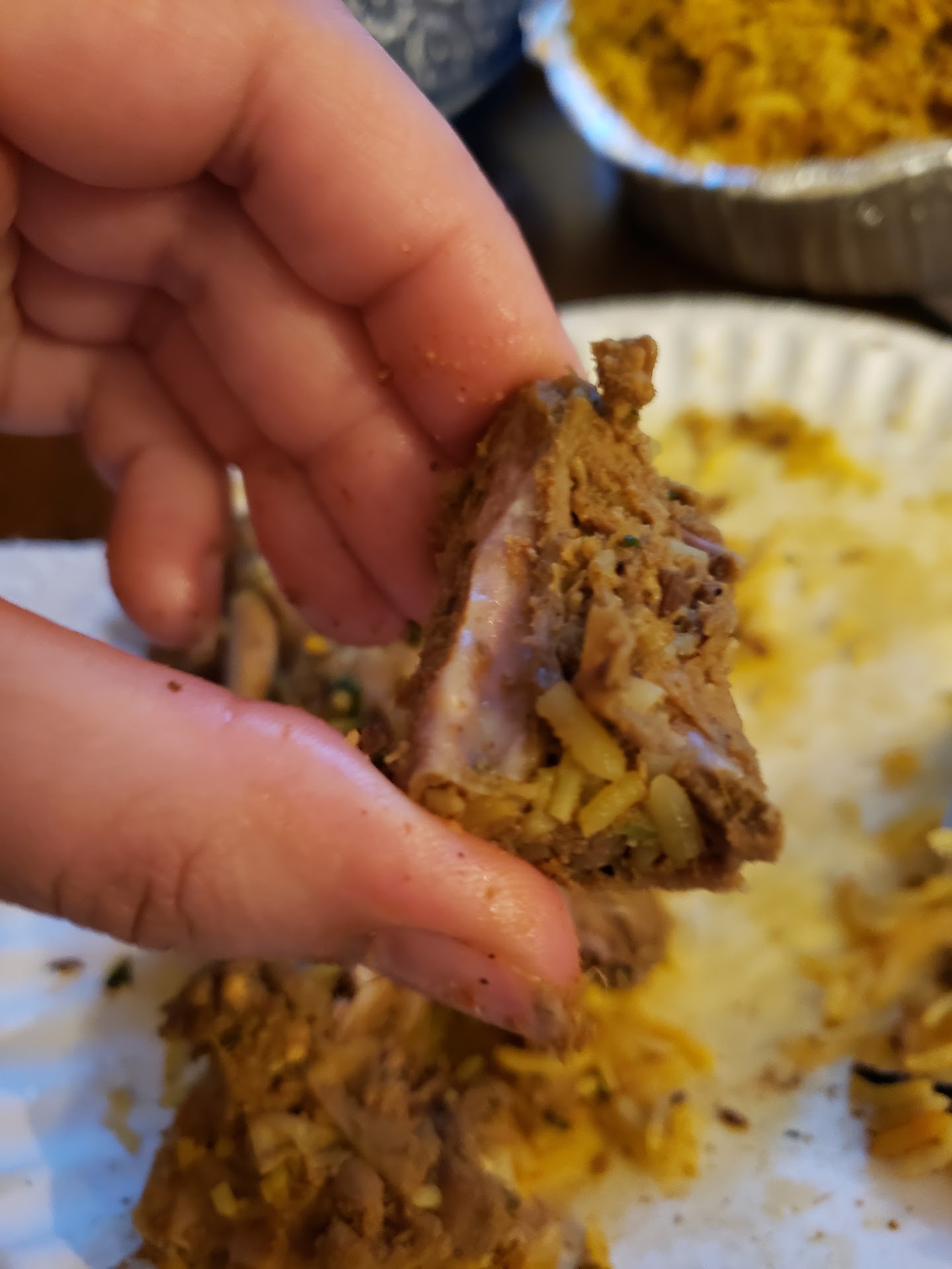 I really really wanted to give this a 5 star. We were visiting family who love this place and go here all the time with only good experiences. I ordered chicken biryani because it's what I like ordering with my partner (from India) in my city, and it's the food he thought i would like off the menu with my food restrictions. The phone was unhooked from a busy day, which is totally cool we went there and my sister put in the food order for take out. While the flavor was okay, the chicken was over cooked and I'm not even sure how it was cut because it was on the bone and in shards. It was nearly impossible to get meat off where i could bite because the meat was tough, there were sharp pieces, making it impossible to eat with utensils. I tried to eat it with my hand to continue enjoying the meal but it wasn't doable. I had to give up after biting into several individual bone shards sans any meat hiding in the rice and almost swallowed a sharp edge of bone.