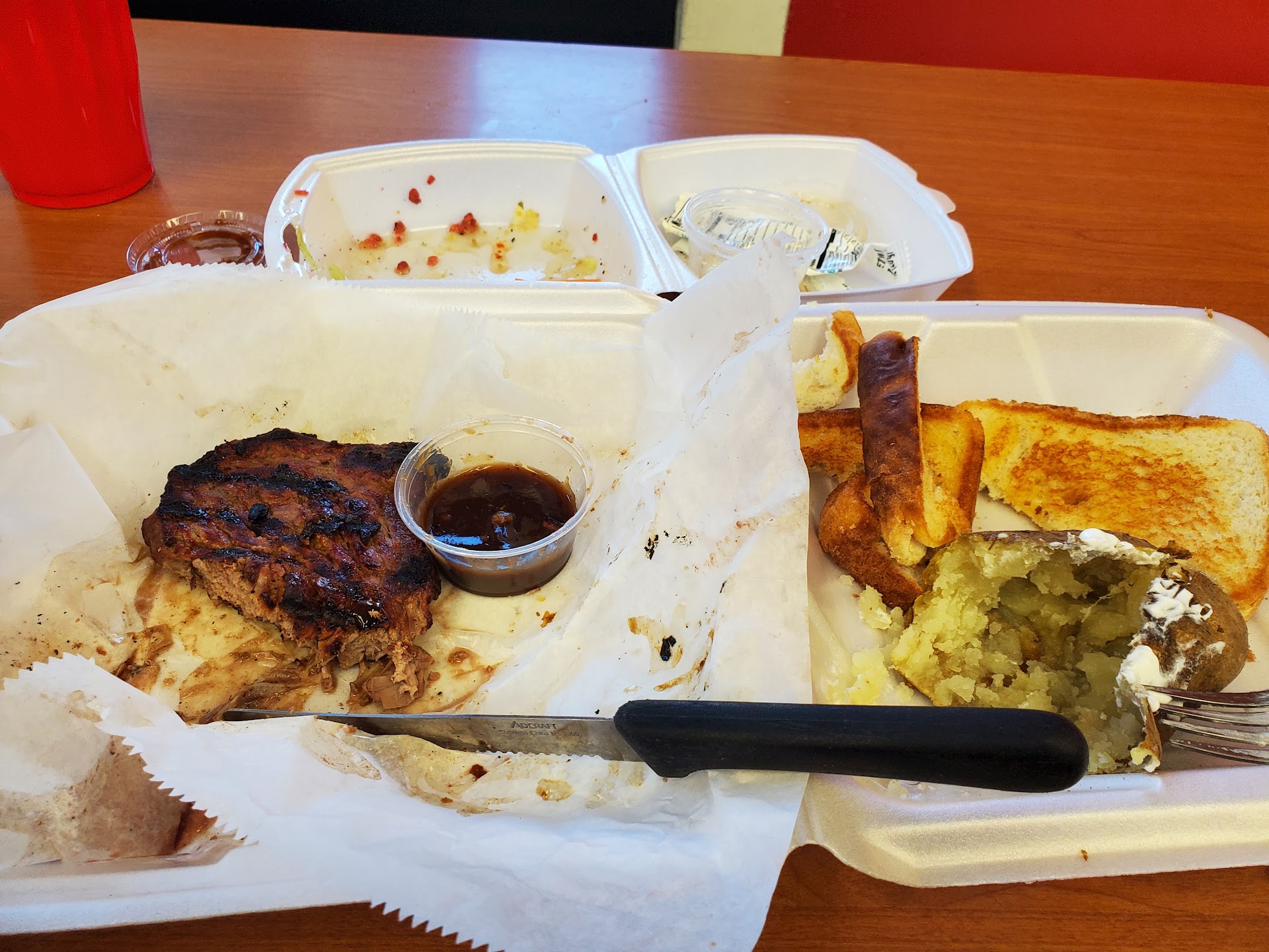 You're better off going to Denny's or Perkins for steak than this place. Just the worst steak and sides I have ever had in a long time. Burnt steak, a drastically overcooked old dry potato, soggy texas toast, and a very sad small salad also served in a styrofoam container. Some people just shouldn't be cooks and this place has...