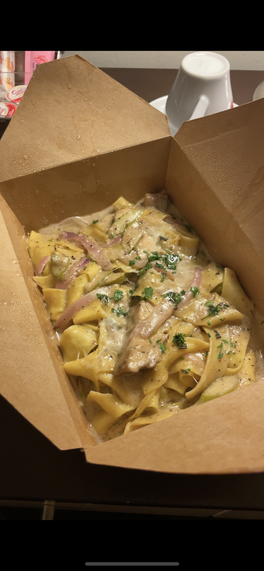 It wasn’t until I was done with my food that I was extremely disappointed. Around 7:30pm on Friday February 11, 2022 (in case you need to check the security cameras)… I came out of my room to try to find a trash can to put the big brown bag and food boxes in. I walked out of my room with my hair up in a sloppy bun and my headphones still on… I just needed to throw this stuff away so I want going to dress up to do that.