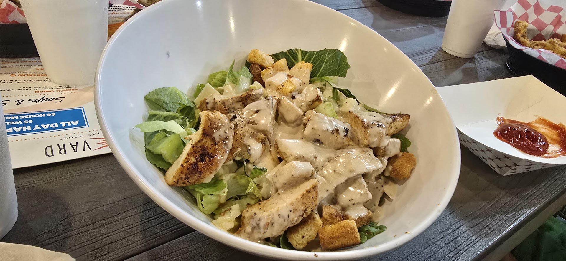 The very last meal to come to our table was a chicken.Caesar salad... multiple hamburgers and other items were made prior to this salad.