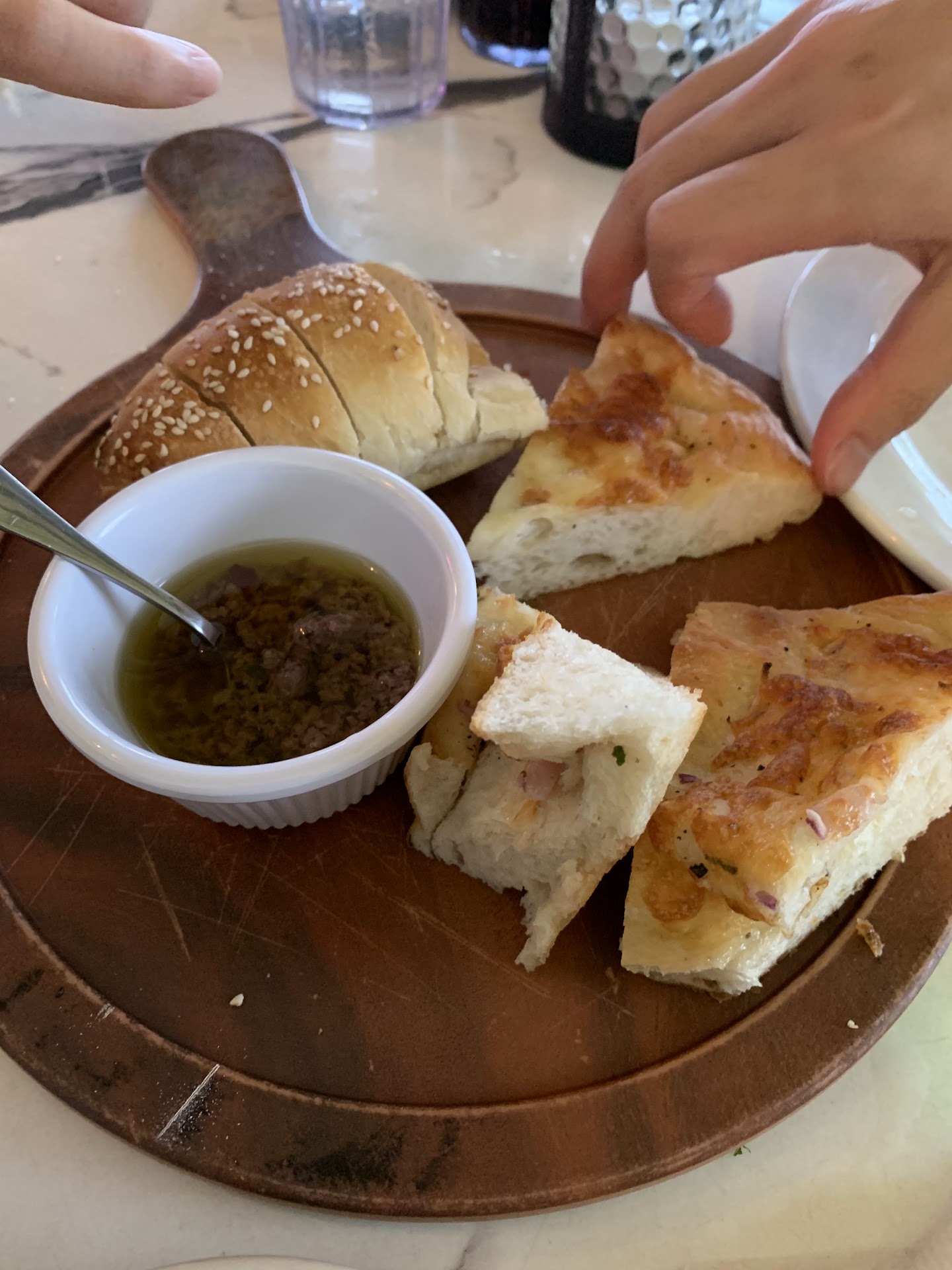 The home made bread was just the beginning of a great night of eating. Itâs served warm and toasty. They give you a sesame roll and a focaccia with a side of olive based pesto dip. 5/5