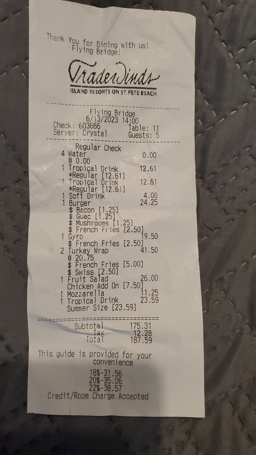 Read moreI would never recommend this establishment for food. We knew to expect higher pricing at resort restaurants and also generally higher pricing post COVID, but don't expect that to include unservable food. We shared a fried grouper sandwich for $31. We were served 8-10 oz of fish on a standard low quality hamburger bun with soggy Ruffles potato chips as the side. Not only is it appalling to me that anyone would even consider placing bagged potato chips on a $31 plate, but the fish was far from fresh. It tasted like 3-4 day old fish that hadn't been stored properly. As if it hadn't been stored at a consistent and/or correct temperature. We're among those that fear sending a meal back because who knows what they'll send next. I am shocked we did not fall ill from eating that incredibly disgusting unservable fish. The drinks were also over priced but tasty. The service wasn't bad. The quality of the food explains why the locals, including some resort employees, recommend dining at off resort...