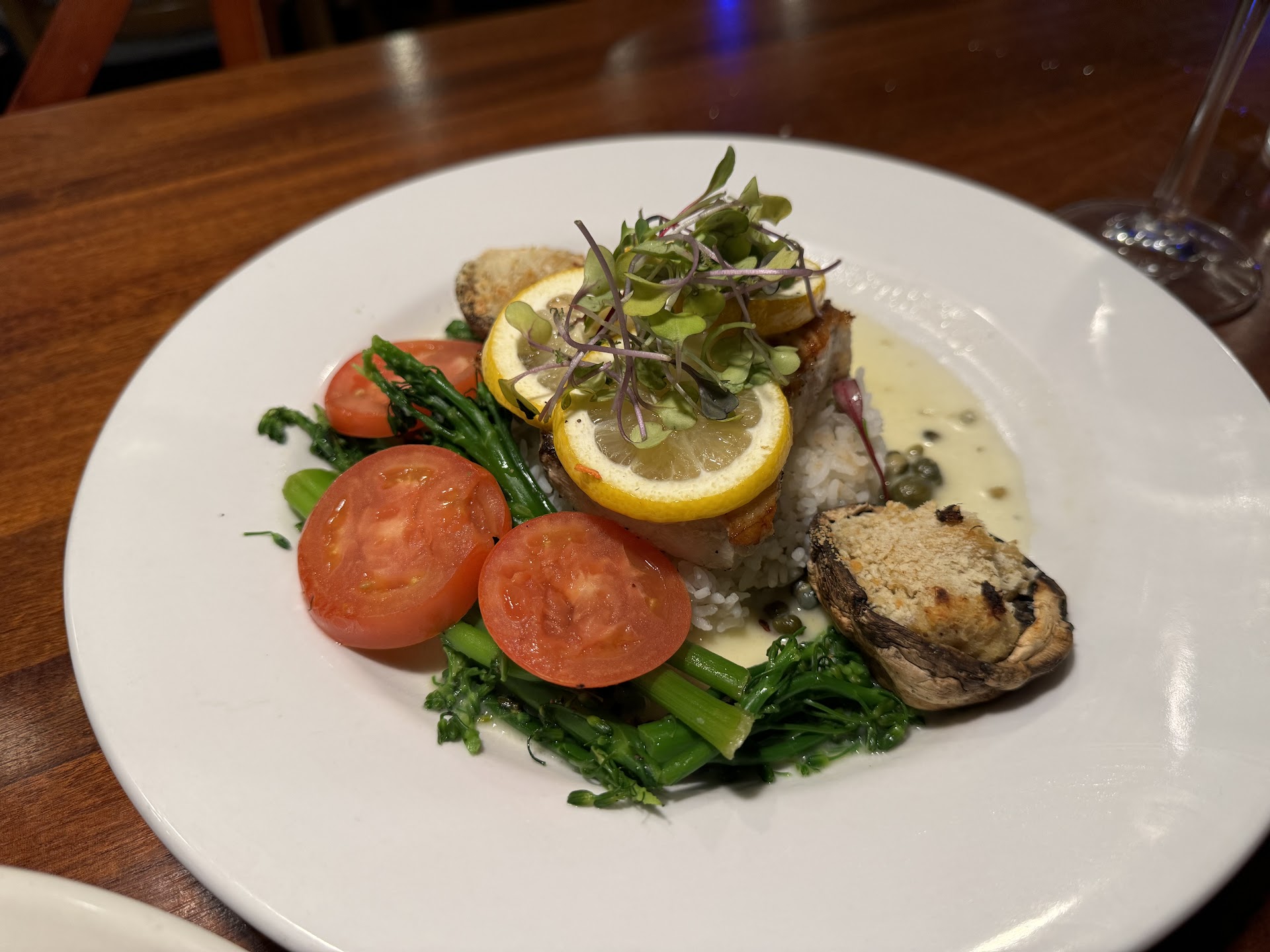 Swordfish Special for the night: I’m a lover of swordfish and this hit the spot. The Mad Fish cooks food the way it is supposed to be done, so this swordfish was outstanding. The slices of lemon, capers, and cream sauce paired so well! They also had broccolini and sliced baked tomatoes that were flavorful and not mushy at all. And then they had a couple of baked mushrooms stuffed with lump crab!