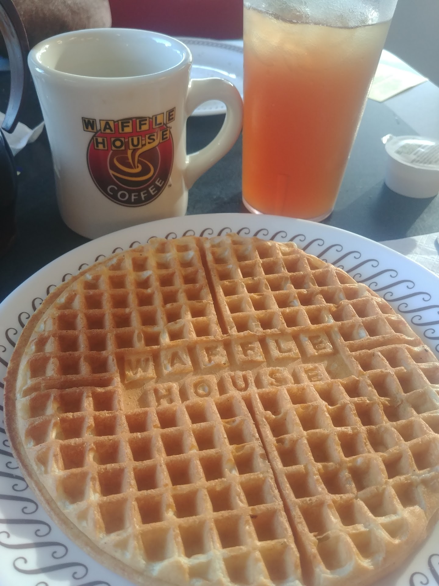 it was dirty, it took our waiter about 20mins to come ask us our drinks, and no one else was on there. our table was nasty( all of them was, cleaned it with a baby wipe) we knew what we wanted. so we told him our drinks 3 cokes, 2 sweet teas, 1 coffee, 1 apple juice. 3 waffles with peanut butter chips, 1 scattered hasbrowns, can't remember what my oldest daughter and mom got, my husband got 2 eggs, ham, toast, and hasbrowns. no problem doing that. we waited and waited, waited for drinks. My son asked me "mom am I ever gonna get a drink my thirty. not to mention how hot it was outside and in side. So our food starts coming to the table. mind you still no drinks. and after about half of our food is there he brings us water and says, "coke is out and he don't know how long he has on the tea, but here's you a water." So we asked what there was and the answer was half of it is empty. So my husband says just give us what ever u have bv we both can't drink water when we eat, has to have some type of flavor. so after another 15mins he brings 3 of us drinks. and we had to ask about the other 2 and my 2yr old daughters apple juice that's in the fridge right across from their table. he said oh yeah il grab it. we literally got it when we asked for 3 to go containers. my son got his waffle at the end so I just let him eat my waffle bc he was sitting there watching every one else eat. he never did get the cup of coffee he ordered. got charged 3.00 for a soda he didn't want and told the waiter no I don't want a soda il wait. he drank the water that he brought that tasted odd so he took a sip and said I'll wait for coffee. but after we all gave up waiting on stuff I asked for the check. and sure enough we got charged for everything. we waited almost 20mins for take home containers. and never got them and asked like 3 times. this was by far the worst experience I have ever had. I will make sure to never go back to this location. we go to Waffle House every week on Friday...