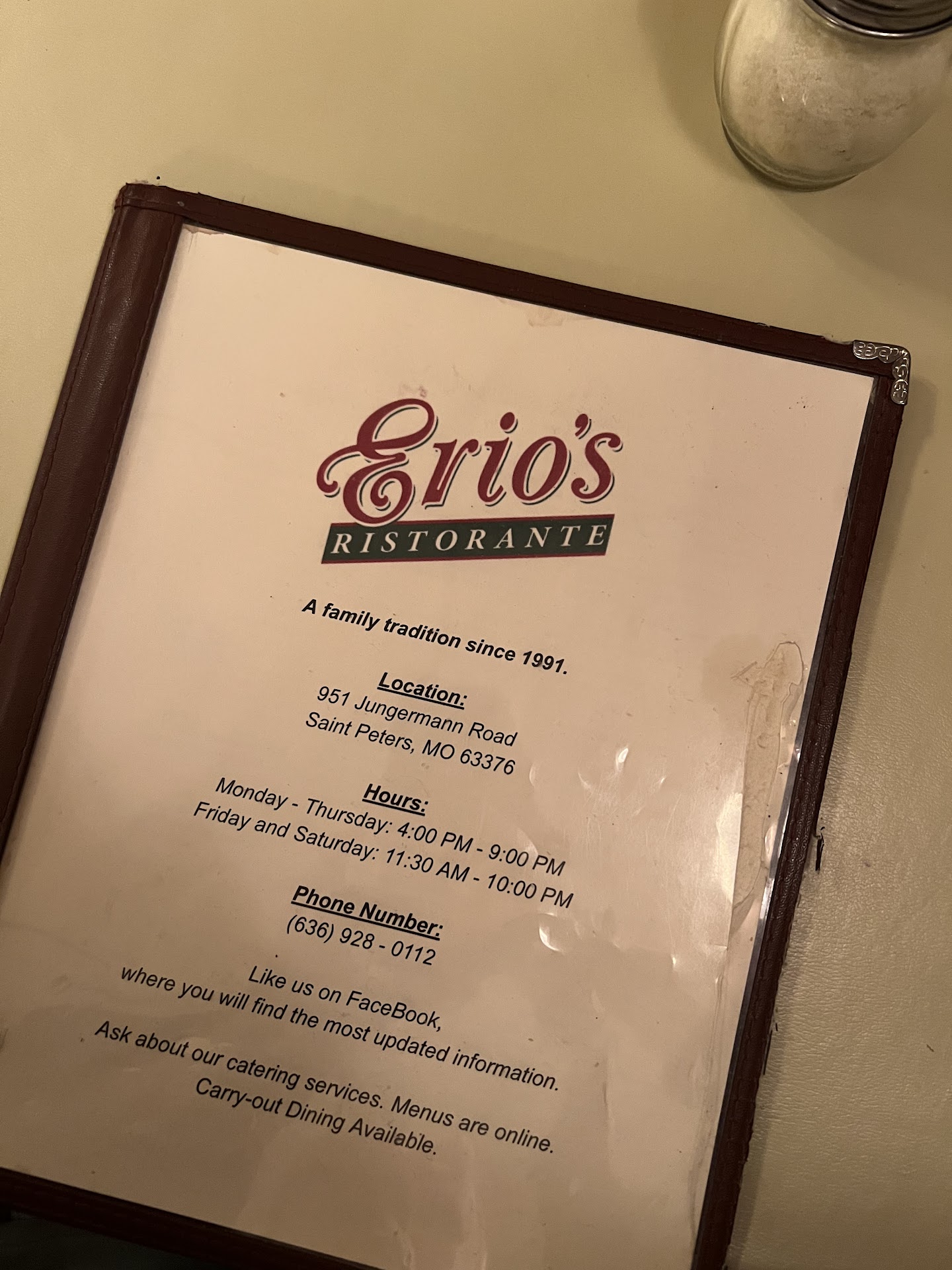 Read moreIt is with heavy heart that I even feel like I need to write a negative review. Me and my family have been going to Erio's for so many years. We took the drive out to St. Peters to have a late lunch on Saturday. And it was terrible. Our server was not friendly, he acted like he wanted to be anywhere but there. After waiting a while for him to come take our drink order, we went ahead and ordered our food at the same time he showed up for our drink order. We ordered cheese bread as an appetizer and he said he would bring it out first and then the rest of the food. We received our bread and then proceeded to wait over 50 minutes for our pizza. We watched people walk in after us, eat, and leave before we got our pizza. The pizza was not good. They definitely are doing something different. It was bland, tasteless, and the dough was raw. We couldn't even eat it ( it felt like they rushed it after we inquired where our pizza was) We would have loved to say something when we were there, but we never saw our waiter. Another lady brought refills, what appeared to be a manager cleared our table. We had to ask someone else for our check. My sister paid cash, told the lady that she didn't need change, and she left her tip on the table. As we were getting up to leave, our server finally appeared in time to get the money from the other server and make a comment that "tipping is customary". He would have know his tip was on the table if he ever actually took the time to "wait" on us. And someone needs to tell that gentleman that tipping isn't customary on terrible service. If he would like to make money, then simply...