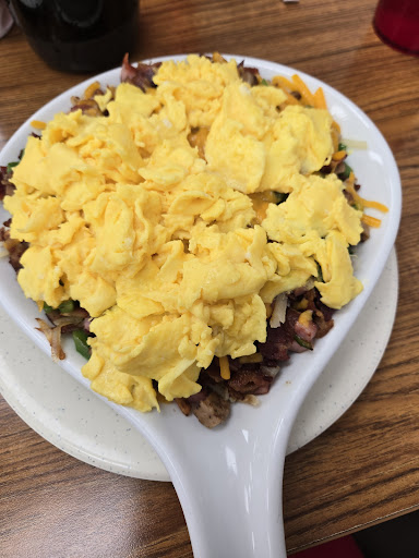 Getting the 2 eggs with Bacon, Hash Browns, and pancakes. Always taking half of it home since it's more than any of us can eat at one sitting.