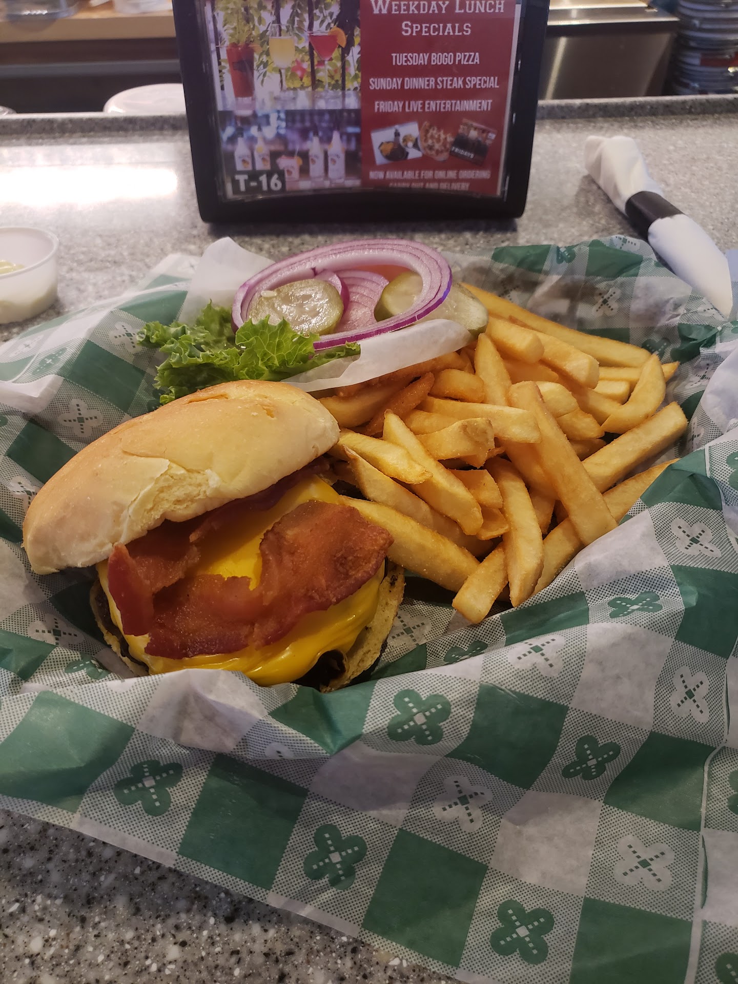 Read moreOk, normally I hate writing bad reviews, but this time I felt like I had to. When we arrived, there was a sign that said to seat ourselves. No problem there. There were about 7 tables that were seated and only 1 waitress. Again, no problem. She took our drink order right away and we started to look at the menu. We placed the order and she walked away. Now, if you knew that your kitchen was backed up and behind, wouldn't you have said so when you took our order? 15-20 min later, she comes back and says that they are out of fries and that we need to make an alternative selection. Again, not a problem. AN HOUR LATER, our food finally arrives. At this point, we have been there almost an hour and a half. I said that I need a to go box immediately since my lunch break was long over. No apology for the long wait for our food or even mention of the wait. Instead, we get an immediate attitude. Long story short, if the kitchen is backed up and behind, not a problem, but you should definitely let the customers know ahead of time so that they can either expect the wait, or go elsewhere if they don't have the available...