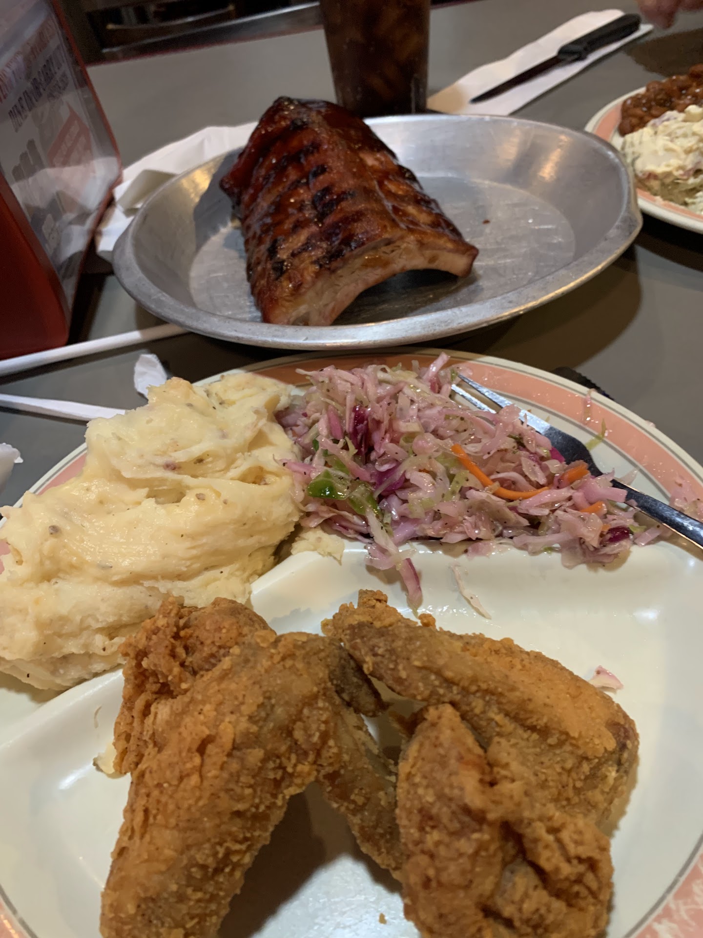 Read moreFried chicken was great. 3 pieces dark was $10 with two sides. We had twice baked mashed potatoes, slaw, potato salad, and baked beans. All had a unique flavor. Potato salad was a little on vinegar side but good. Slaw had a slightly sweet vinegar and oil and was delicious. The baked beans had a unique flavor I couldn’t identify and were good. The twice baked mashed is very much a bacon flavor. If you don’t like bacon in your potatoes don’t order. If you do, you’ll love them. Ribs were not bad. Dry. Tender. The staff was very kind and helpful. We made the mistake of going at noon on Wednesday. Line of 20 people that was still long when we left at 1:15. Wait was about 15 minutes. You have to sign up on a list then stand in line for n a narrow hallway. If close proximity is not your thing, may want to find a less busy time. Everything is cozy. Tables, line, crowd. Food came out within 15 minutes I think. The half slab with two wings and sides was $20. Total bill for pictured was &34.80. I had water. Did I mention how kind and efficient the waitress and hostess is? People arose me me had some amazing looking hamburgers and potato soup. If I go back I’d try the chili (spicey and regular) and hamburger. I’d also get nat a not peak time. Im wondering if...