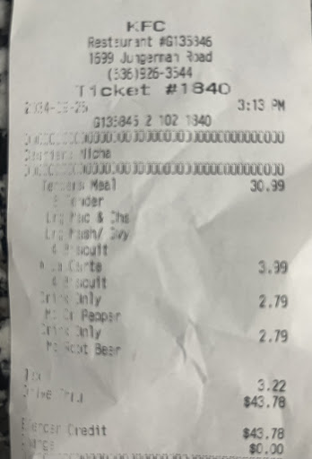 Read moreI just got back from a trip to this KFC. I went thru the drive-thru and ordered 2 3-pc boxes, both sides mashed potatoes & gravy with a large side of cole slaw. I asked for and paid for one of them to be one leg and two breasts. Typically they contain one each, leg, thigh & breast. I dislike the thighs specifically and ordered my meal accordingly. When they gave me the bag I checked the contents and found that they had shorted me two sides of potatoes & gravy. When I brought it to their attention it seemed as though I was bothering the young man as I felt he gave me a lil attitude when he asked for the bag back. I had to further explain that both boxes should have two sides and both of mine only have one. They rectified that issue and I left.