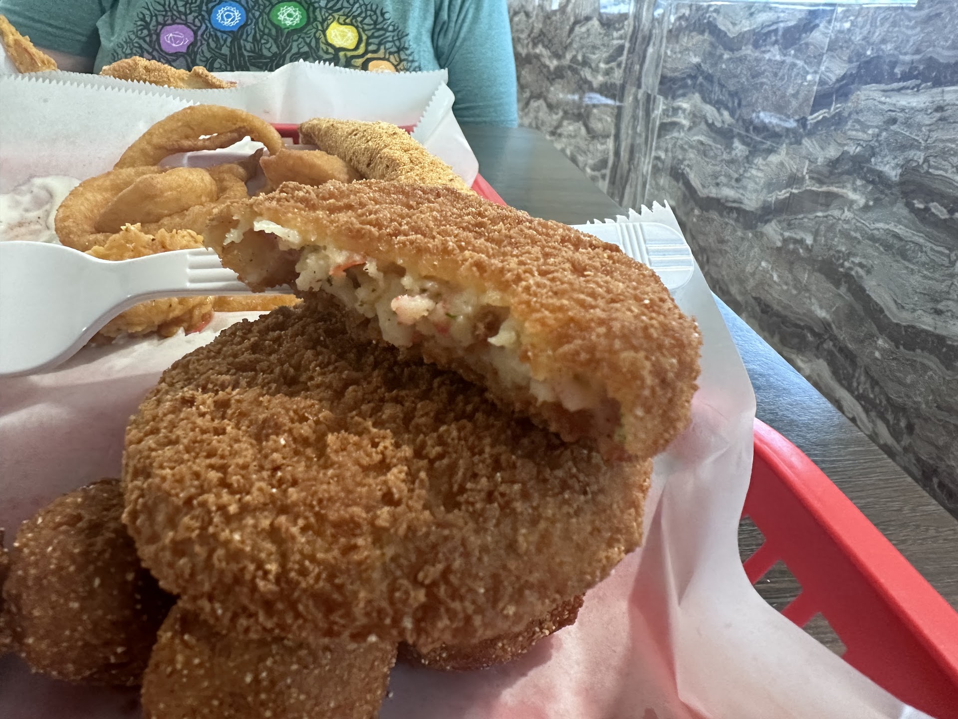 The side of hush puppies was 4 small balls. IDK what I was expecting, but if I get 4 balls for $3, they should be bigger or be so good that they are worth the price. They were really dry, and the flavor was buried by the taste of overcooking, or maybe they were old. Either way, I'm not a fan.
