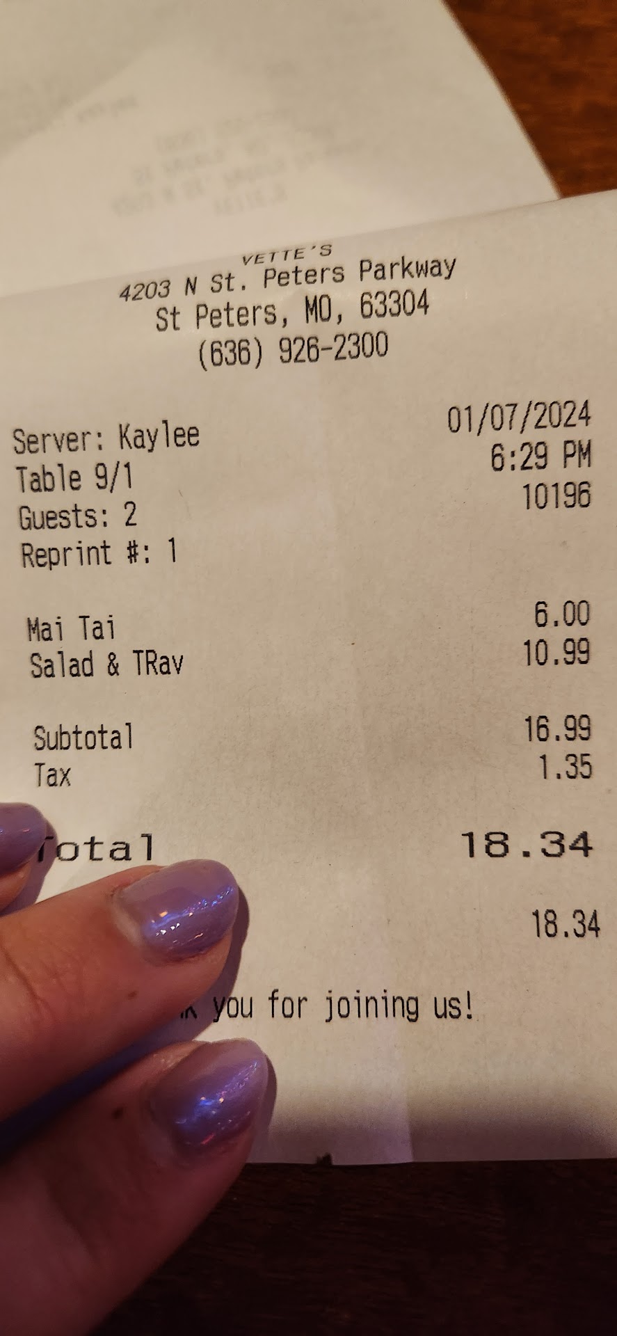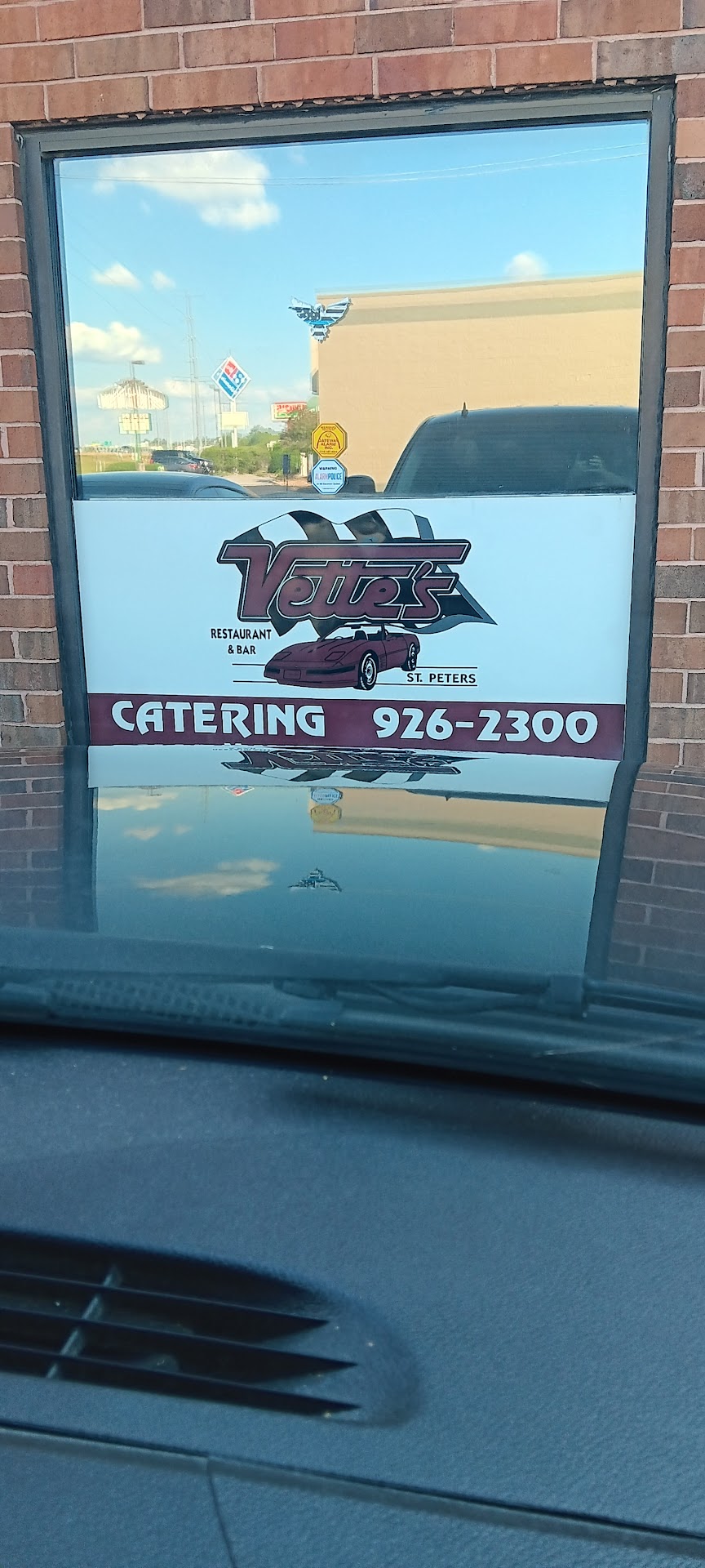 Im going to be brutally honest because i believe thats what this place needs. I chose to eat here because of the ratings from the locals. We stopped by Vette's around 5pm on a Sunday. Place was not busy but had a party of 20 in the back. We ordered an appetizer of potatoe wedges with bacon and cheese. When they arrived at the table, the potatoe part of the wedges was not edible. Burnt to a crisp and then covered in cheese. I ordered the catfish dinner that comes with Cole slaw,hush puppies and fries. The person I was with ordered the turkey club with fries. After waiting about 30 minutes for our food, we realized there was only 1 waitress working the whole place. Someone from the kitchen brought our food out and walked away. I looked at my plate with disappointment as I noticed my fries were sitting in a pool of liquid. Upon further investigation I realized it was water dripping from the catfish nuggets as they were probably frozen at some point. I used my 1 napkin to soak up the fishy liquid that my fries were sitting in. Digging into the fish was not great either. Some parts were not done as other parts of the fish were overdone. My cup of tartar sauce had a film on the top of it, My fries were now soggy and smelled like fish. If I was going to choke this down, I needed ketchup and napkins. After waiting about 10 minutes we didn't see a waitress, so I got up and went to the bar, stood there about 5 minutes, still no waitress. So I sat back down, looking at other tables for ketchup. Finally, we see our clearly overworked waitress and she gave me a small cup of ketchup but by then my fish and soggy fries were cold. I should also mention that my partner, who eats almost anything, said the Cole slaw was gross. Dear Vett's, I hope you pay your waitresses a decent wage If you are going to understaff the place. Maybe 1 more person in the kitchen or on the floor would improve the overall quality of the entire place. A good cleaning wouldn't hurt either as the floors and tables are sticky enough to catch a mouse. This would be a pretty sweet place under different...