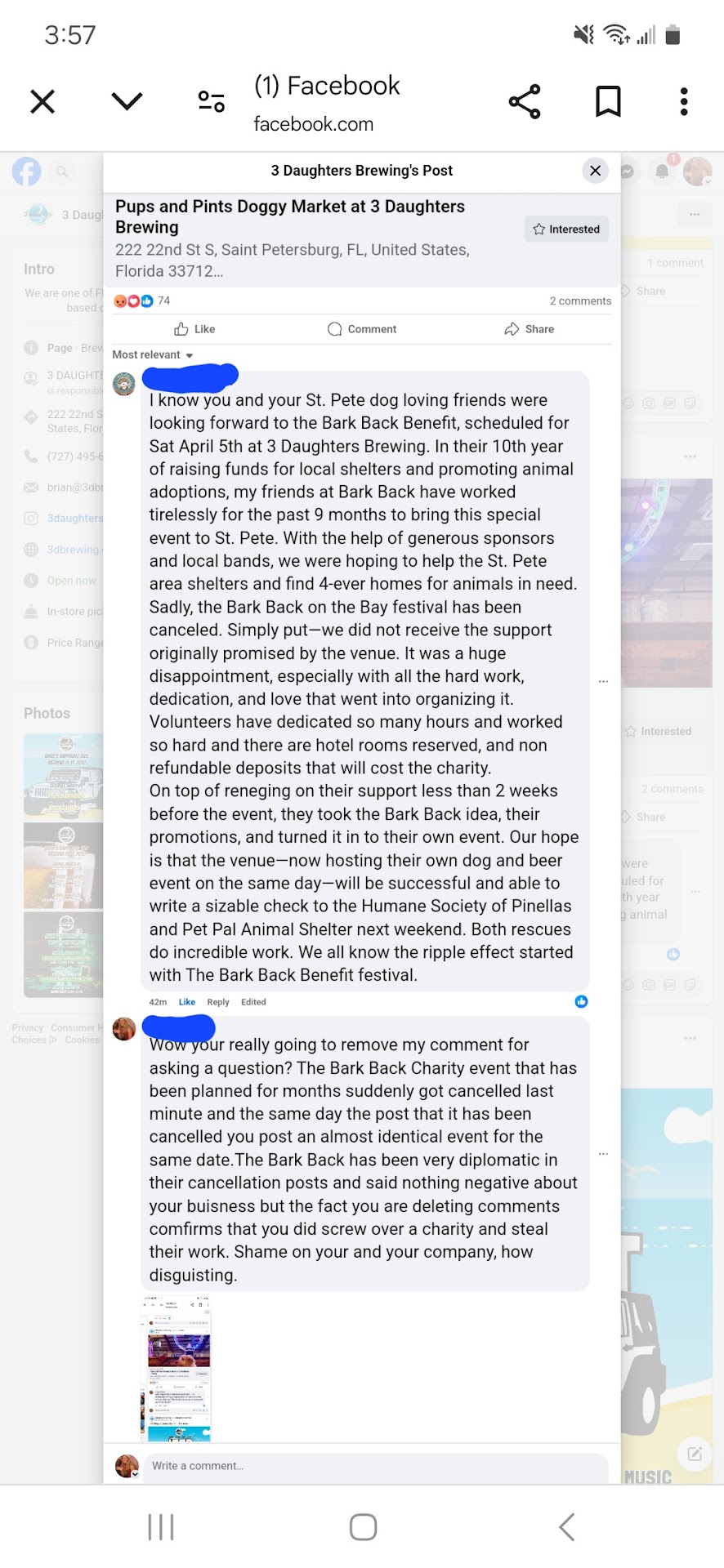 Read moreI would like to disclose first off that I have never been to this Brewery and my review is not about the products that they are selling but about the character of the people who own and run this buisness. This business was to be the venue for a charity event on April 5th, and they canceled on the charity within 2 weeks of the event and on that same day, stole the idea of the event and rebranded it without the charity. I had posted on their Facebook asking about why the event had been changed to now exclude a respectable charity and had my post immediately deleted. The post was not hostile or offensive but simply questioned the change in events. Based on the large number of negative reactions they had but no comments, it is my belief that they are in the practice of review gating. I cannot speak directly to the interaction between the Brewery and the charity but I am sharing my experience with how the Brewery choose to respond when their actions were questioned. I am attaching a screenshot of my original comment that was deleted and the current comments which include the discussion of the cancellation by someone involved, in case that too is deleted. Based on my experience with this company and the information shared about how they work with other business and charities, this is not a place that is operating ethically and honestly and does not deserve...