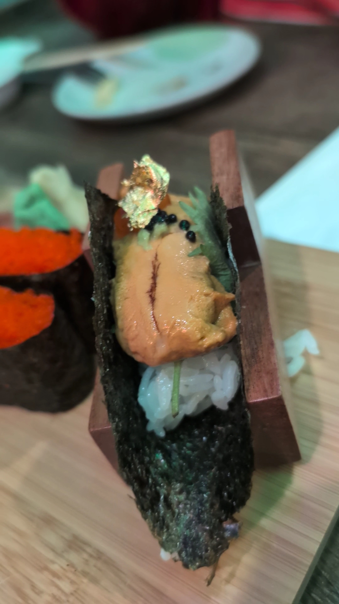 The real standouts for me were the Scallop and Uni nigiri. The Scallop nigiri was large, sweet, and lightly seared, topped with Ikura, Tobiko, and a touch of Yuzu Jalapeño that enhanced its natural flavor beautifully. But the Hokkaido Uni? Absolutely mesmerizing. Served as a hand roll with Ikura, Caviar, and gold flakes, it was pure, custardy perfection. My girlfriend, after one bite, immediately ordered her own—and in true foodie fashion, I followed up with another myself.