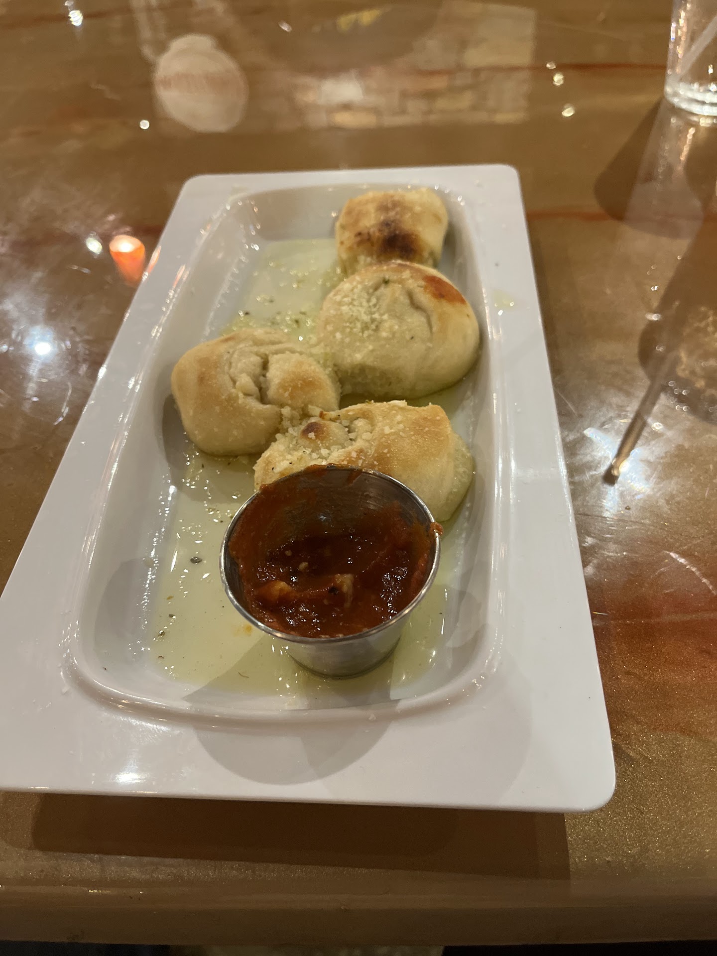 The initial dish consists of garlic knots. I will be selecting a streamlined menu that includes an appetizer, an entrée, and a dessert, focusing on options that are both prompt and uncomplicated. Upon receiving my first dish, I encountered an unappealing flavor and an unsettling texture, as if the food had been left out and subsequently reheated in a microwave.