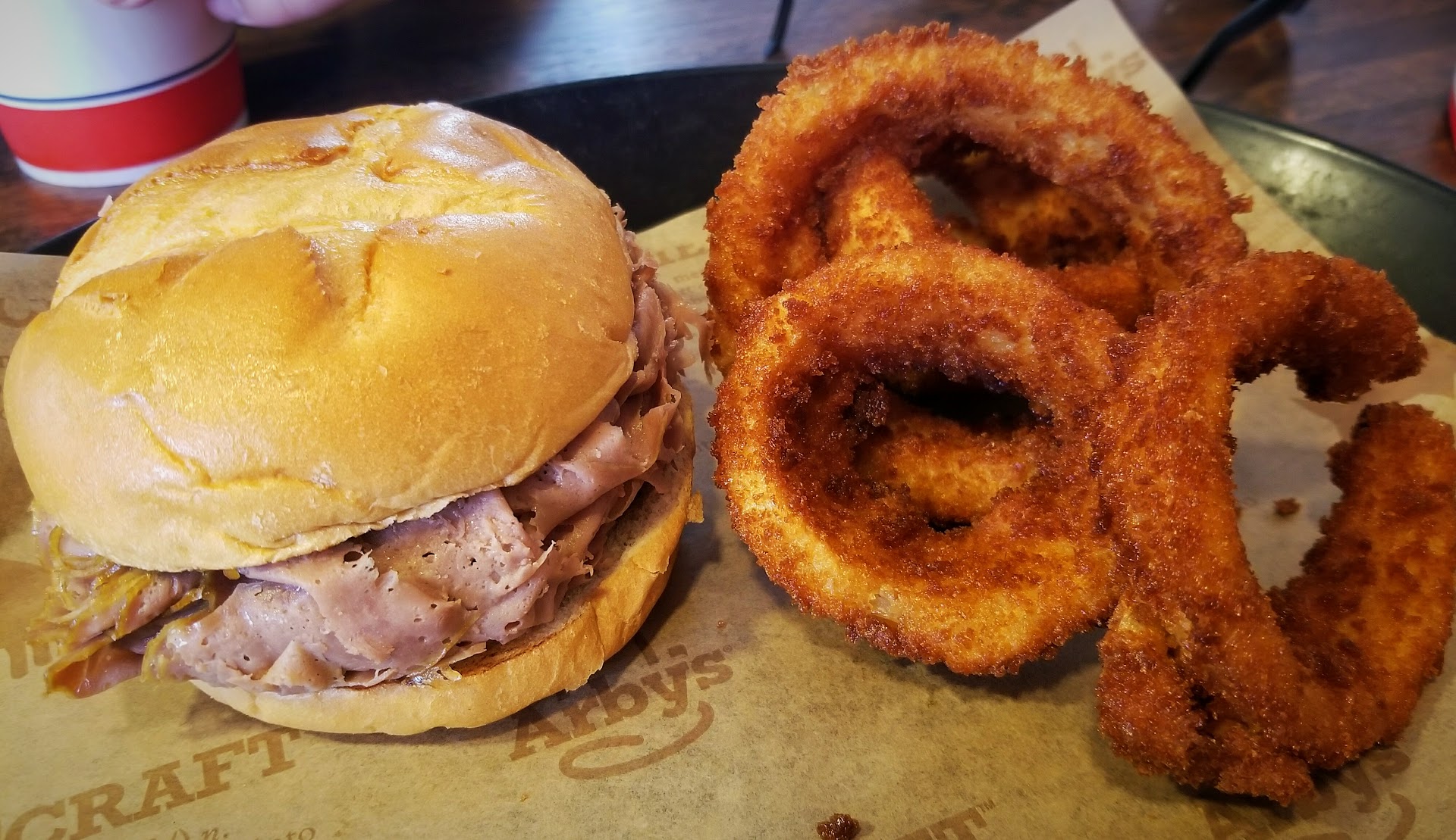 I placed my order with a very friendly manager who smiled, was very friendly....she was a great example of how an order should be taken while dining in at a fast food joint. I then watched as the onion rings I had just ordered were freshly placed in the frier. Even though they were freshly cooking my onion rings they came out super fast along with my double roast beef sandwich. Sandwich was delicious as always and onion rings were better than expected (I had never tried Arby's onion rings before) they were big, super crispy and delicious! The onion rings were of the quality you would expect at a sit down restaurant. They did not have a specific onion ring dip which would have been great but ranch worked out fine.