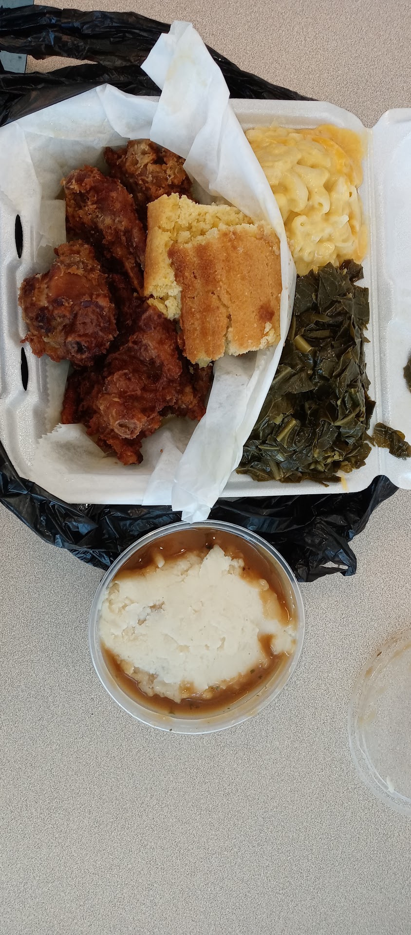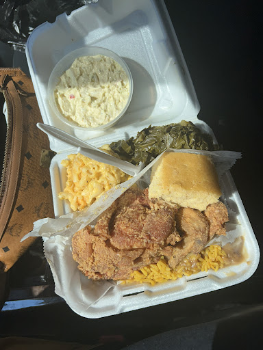 I decided to give you all a try on Saturday 9/6/25. I arrived and called the number. After attempting a few times I finally got through and the staff who answered was very nice and shared with me how ordering works. I had to park well away from the entrance but she assured me after taking my order that she would come to me with my food and for payment. The food took about 25 minutes so I suggest calling ahead. I ordered the fried chicken dinner, it comes with three sides as one is automatically rice. So I ordered yellow being you have a choice of either yellow or white. I also ordered mac n cheese and collard greens! I ordered potato salad as an additional side and one of their signature drinks! I believe it was peach lemonade, it was tasty. The chicken was fried fresh and delicious however just fried a bit too hard. The mac n cheese was cheesy and would’ve been better had it been served hot, it was merely warm but it was “good” too however cut back on some of the velveeta. The greens were tasty but had a hint of pepper spice’ however it wasn’t overpowering. The rice and gravy was prepared well. I enjoyed my meal but the reason for my four stars is due to the potato salad. Sadly it wasn’t southern and possibly store bought! It was overly creamy seemly tasting exactly how macaroni salad does and it had no eggs. So imagine that creamy base with potatoes instead of pasta. Wasn’t nasty just not traditional and different. I was extremely disappointed being this is an authentic soul-food restaurant. Surely someone there can make homemade potato salad and the southern big back kind our people are use to. So yes i removed a star from it being that specific dish is a staple to us just like fried chicken! Nonetheless i will be back and looking to try one of their many other sides being they have a lot to chose from and a large menu also specials. This restaurant was busy and customers were happy so that’s always a plus when you see that during your first try. So overall from the pleasant staff to the food I definitely recommend....