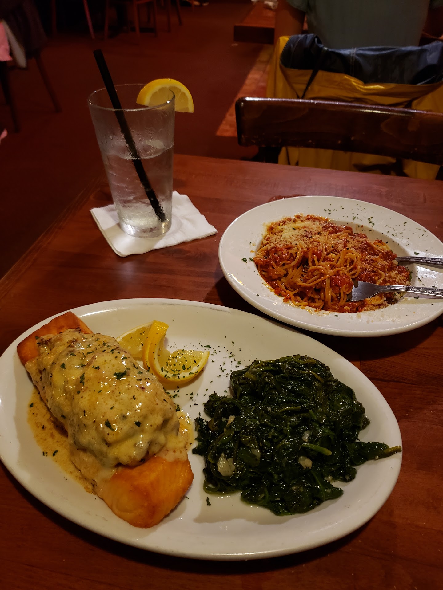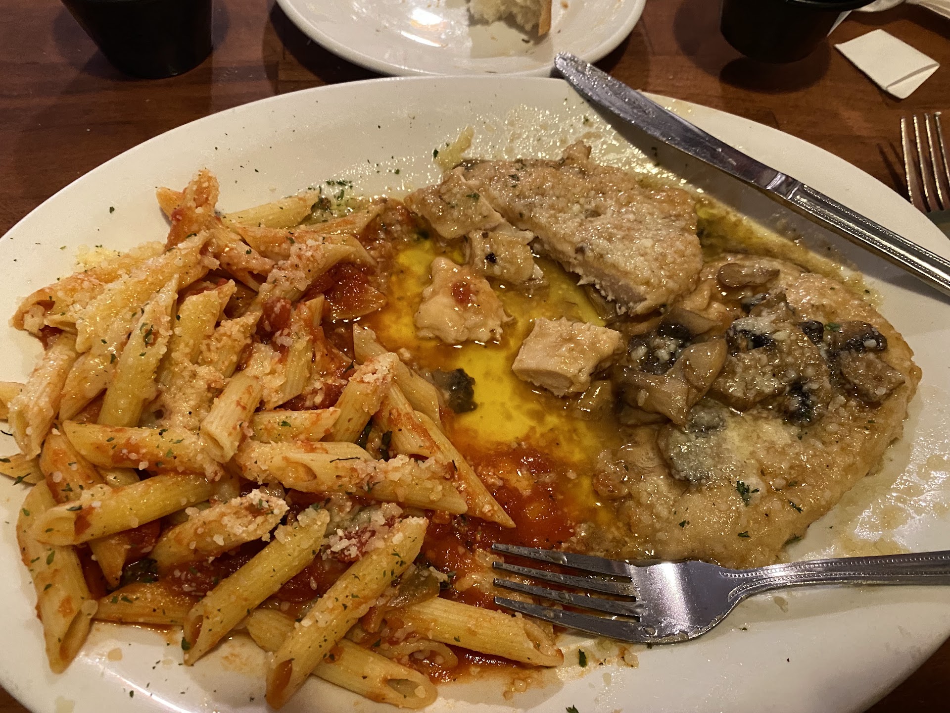 The Chicken Marsala, sautéed in a marsala wine sauce and fresh mushrooms. The flaccid soggy meat sat in a thin (and clear!?!) Marsala sauce which tasted and looked completely irregular, unlike Marsala wine at all. This was served with pasta and marinara which totally clashed with the entree. Also ended up uneaten and in the trash, with the $10.95 it cost.