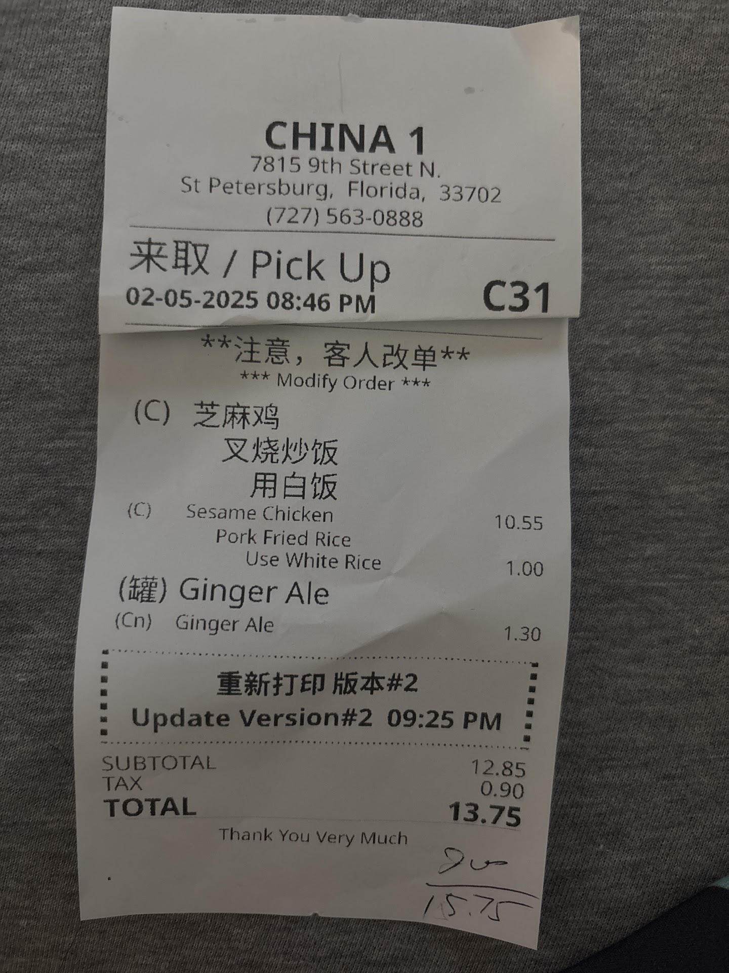 I do want to add that on the original night I went it was unusually busy. I have gone to China One several times in the past and never saw so many people trying to order at the same time. The line was literally out the door with people even outside. This was probably unexpected for them as well so I understand that they were probably overwhelmed. Call it chaos or could it be maybe the food is just that good.