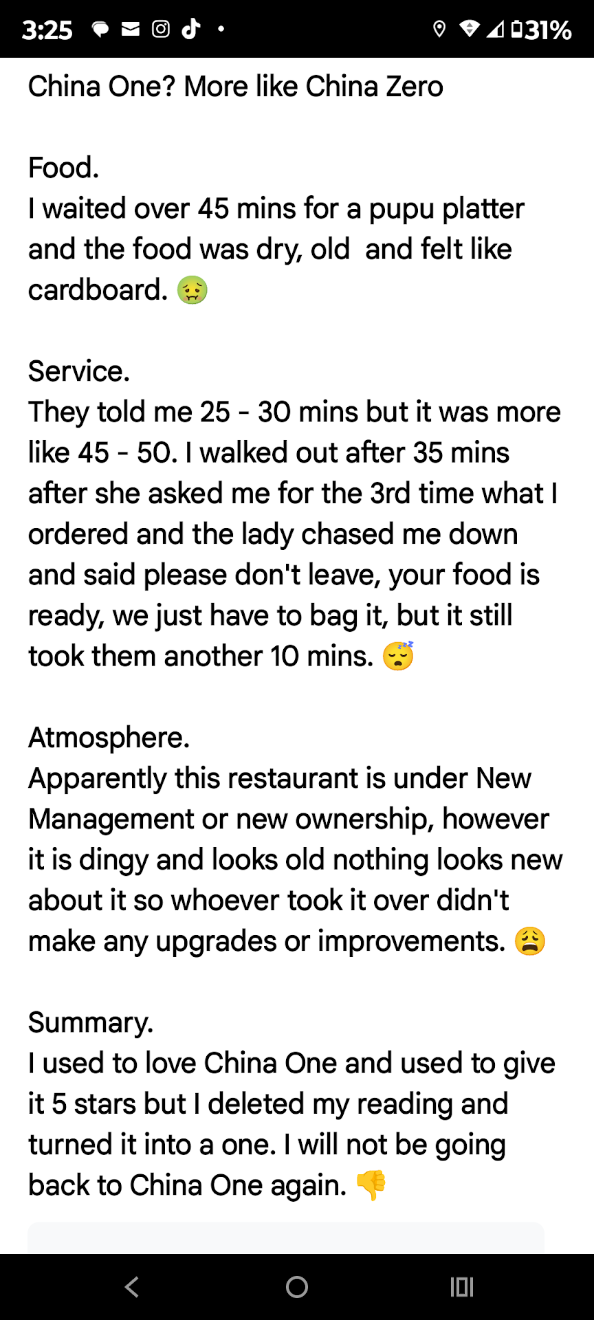 I have been going to China One for almost 15 years. I have never bad been unsatisfied. Everything is always fresh and delicious. Customer service is great.