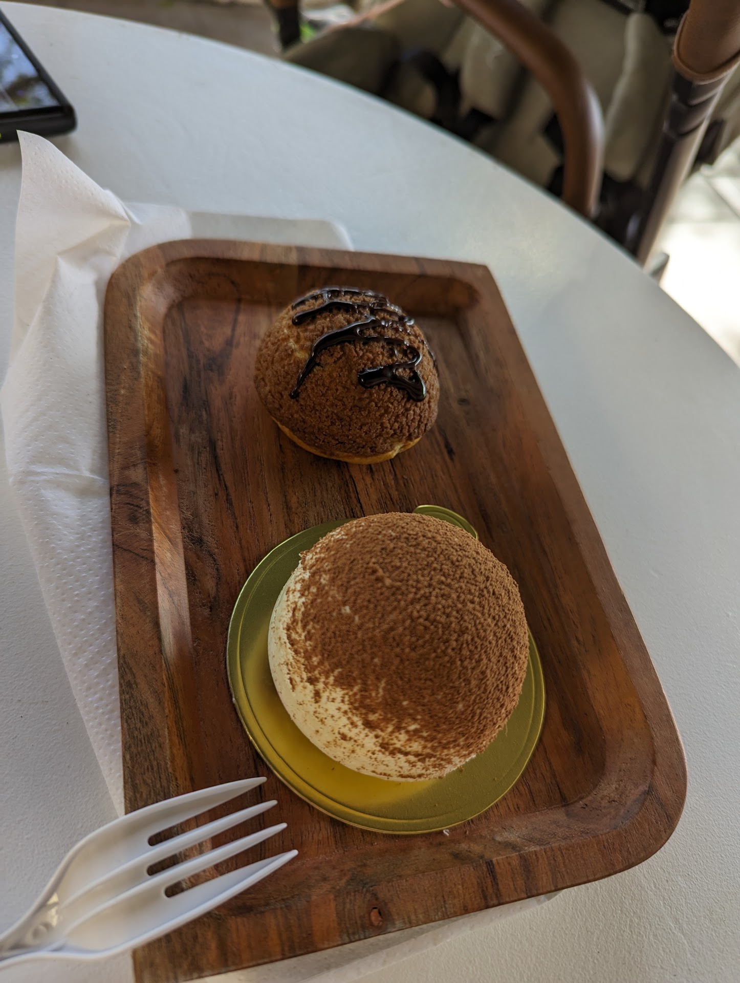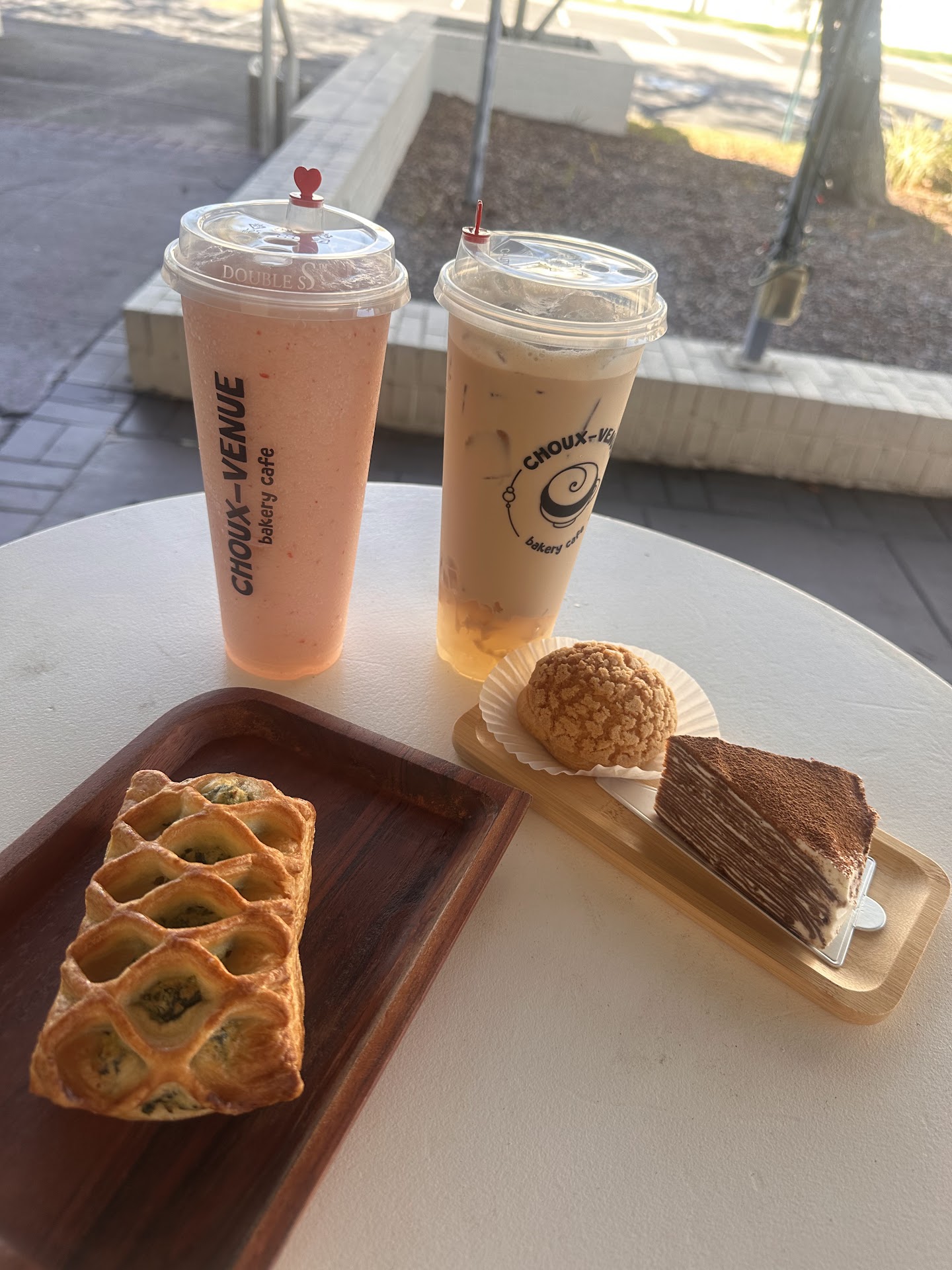 Read moreWe stopped here on the way to st.Pete. We were in and out within 10 minutes. I got the spinach and cheese croissant. It was one of the most delicious croissants I’ve ever tasted. For dessert I got the tiramisu crepe cake. It was good but it didn’t blow me away like the croissant. I got lavender milk tea with boba, which was perfectly made and delicious. My boyfriend got the cream cheese cream puff and he said it was fantastic! He tried my food as well and loved the croissant, but he was not blown away by the tiramisu crepe cake. He got a frozen strawberry lemonade to drink and it was AMAZING! We are big lemonade fans and it’s hit or miss, but this was a big hit! It cooled us down on this very warm day. The atmosphere was great! The decor was very chic and cool. The music was great as well. There is tons of parking. It’s easy to get to and from the cafe. The ladies working there were nice the bathroom was very clean. The bathrooms are clearly marked for customers only. There is outdoor seating with shade, which was great for us. We will def be back and we recommend you give...
