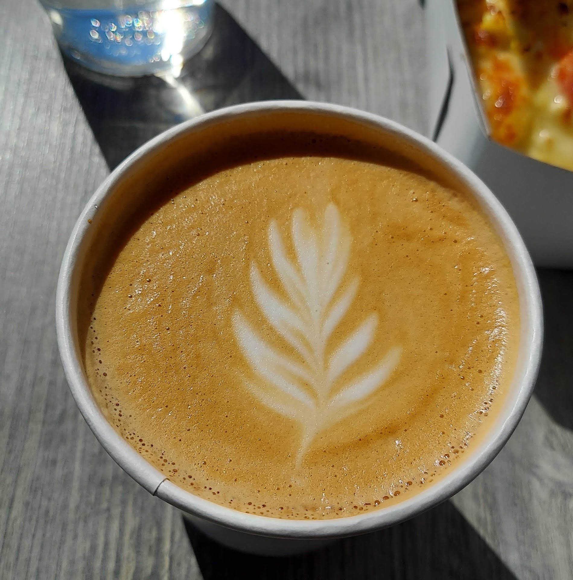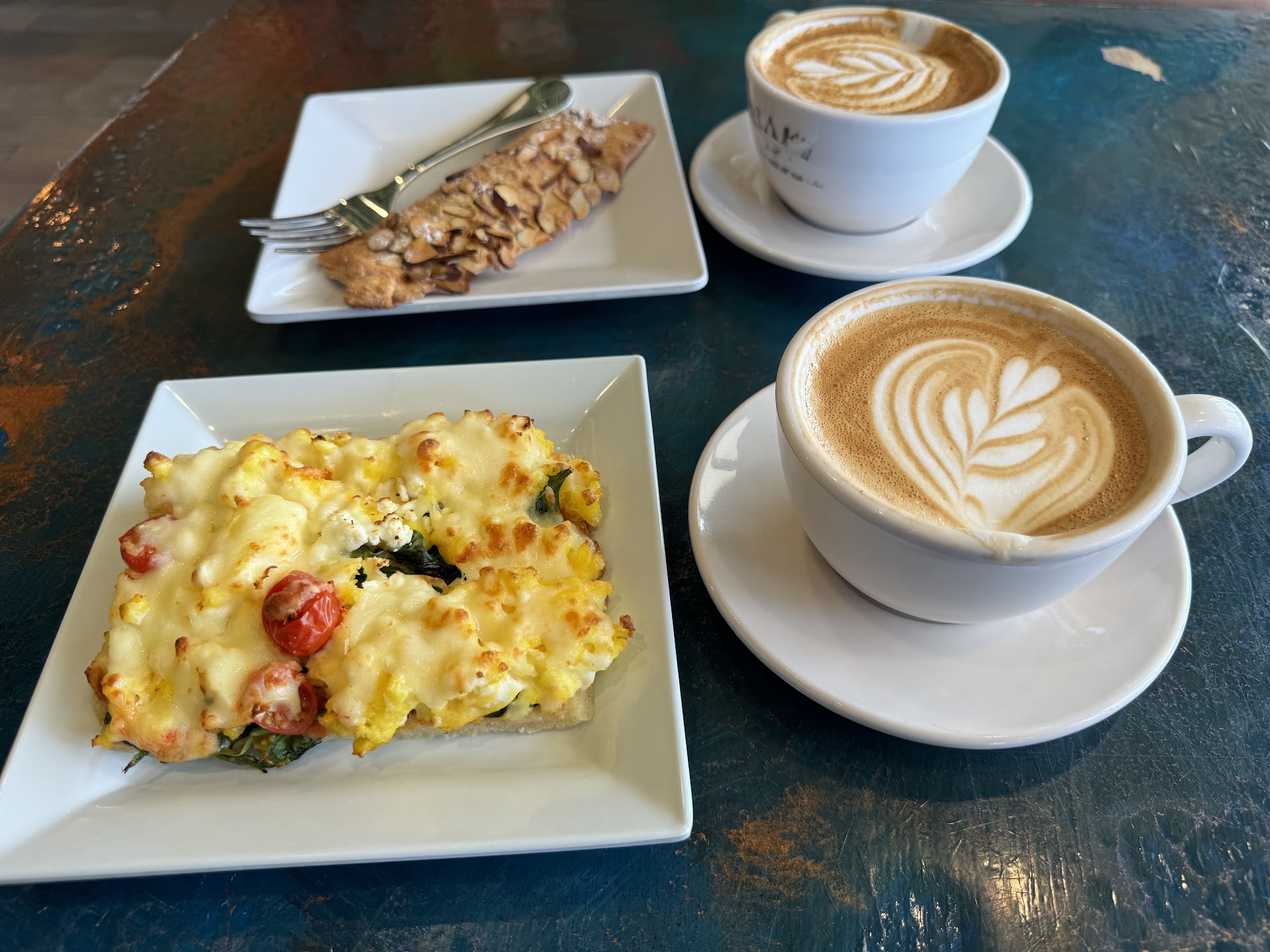 Atmosphere: 5/5 I enjoyed the atmosphere of this place. The interior design was fresh and inviting. I saw what I figured was reclaimed wood on the walls which added a nice touch to the design of the cafe. Simple dishes/silverware. My only complaint is lack of pricing. There were no readily available prices for the baked good items that I could see. OTHER than that, the baked goods are displayed very well. They are all easily visible.