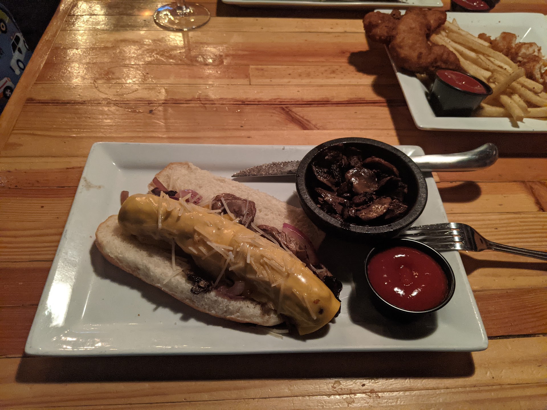 This past weekend, my husband and I visited a popular bar/restaurant in downtown St. Petersburg, renowned for its gourmet and creative burger menu. Despite the definite bar vibe, the atmosphere was welcoming, and the staff made us feel right at home. We were greeted immediately with waters and menus, and our server, Marina, was fantastic—friendly, attentive, and on top of everything, even as the place filled up quickly for lunch. The menu was a burger lover’s dream, with so many unique options it was tough to choose. We started by splitting their famous corn dog as an appetizer, featuring an all-beef Vienna sausage encased in a perfectly crispy coating. It came with house-made sauerkraut, which was a standout—balanced, not too sour, and with just the right amount of texture. Easily some of the best I’ve had! For our mains, my husband went with the Black and Blue burger, and it was a hit. Loaded with bacon, blue cheese dressing, crumbles, and a kick of Frank’s hot sauce, he called it phenomenal. His side of tater tots was crispy perfection, though fries and sweet potato fries were also tempting options. I opted for the Demigod—caramelized onions (done just right), sautéed mushrooms, three cheeses, and horseradish mayo. It was good, but after sneaking a bite of his, I’ll admit he won! My burger came with a house-made cucumber and tomato salad, which was fresh and a nice nod to healthy eating. That said, it could’ve used a bit more dressing or some marination time to elevate the flavors. Overall, the food was outstanding, the service was top-notch, and the vibe was spot-on. If you’re in St. Pete and craving a burger that’s unique and delicious, this place should be added to the list! It’s really a 4.5 for the service, burgers...