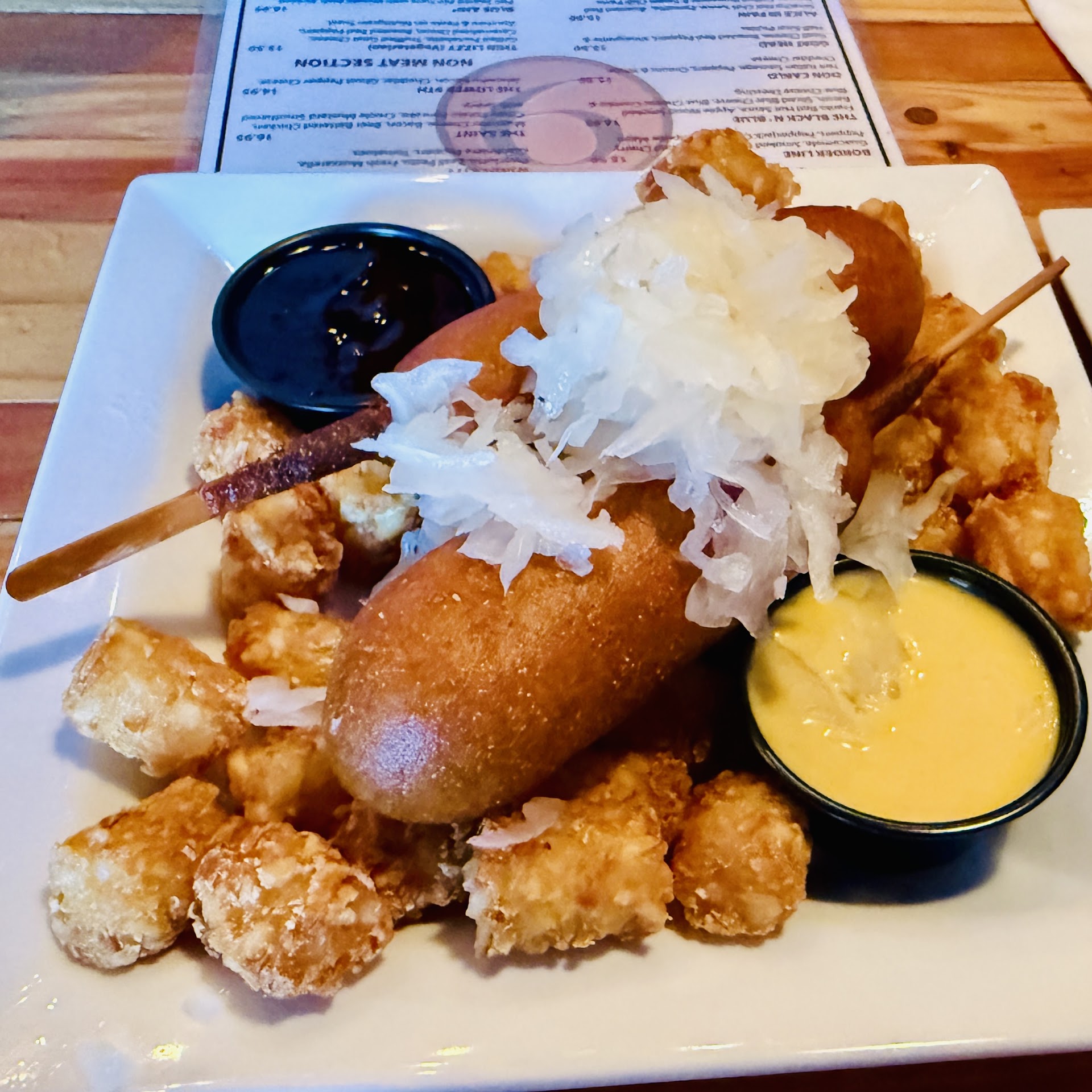 This past weekend, my husband and I visited a popular bar/restaurant in downtown St. Petersburg, renowned for its gourmet and creative burger menu. Despite the definite bar vibe, the atmosphere was welcoming, and the staff made us feel right at home. We were greeted immediately with waters and menus, and our server, Marina, was fantastic—friendly, attentive, and on top of everything, even as the place filled up quickly for lunch. The menu was a burger lover’s dream, with so many unique options it was tough to choose. We started by splitting their famous corn dog as an appetizer, featuring an all-beef Vienna sausage encased in a perfectly crispy coating. It came with house-made sauerkraut, which was a standout—balanced, not too sour, and with just the right amount of texture. Easily some of the best I’ve had! For our mains, my husband went with the Black and Blue burger, and it was a hit. Loaded with bacon, blue cheese dressing, crumbles, and a kick of Frank’s hot sauce, he called it phenomenal. His side of tater tots was crispy perfection, though fries and sweet potato fries were also tempting options. I opted for the Demigod—caramelized onions (done just right), sautéed mushrooms, three cheeses, and horseradish mayo. It was good, but after sneaking a bite of his, I’ll admit he won! My burger came with a house-made cucumber and tomato salad, which was fresh and a nice nod to healthy eating. That said, it could’ve used a bit more dressing or some marination time to elevate the flavors. Overall, the food was outstanding, the service was top-notch, and the vibe was spot-on. If you’re in St. Pete and craving a burger that’s unique and delicious, this place should be added to the list! It’s really a 4.5 for the service, burgers...