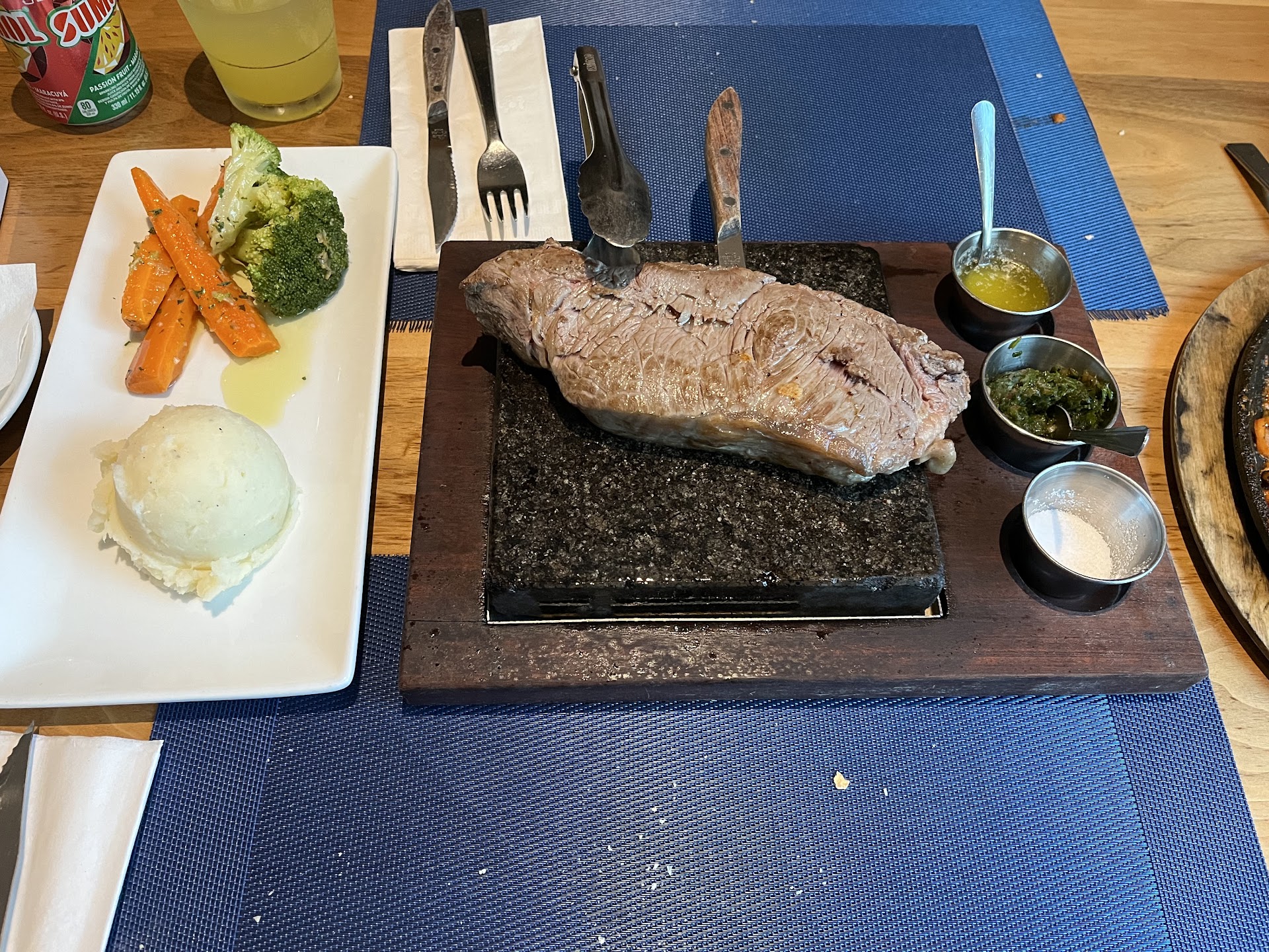 My partner and I both got the steak on a stone (Bife Na Pedra) for our entree and bland doesn’t even begin to describe it. 1) they bring your the steak on a hot stone but do not give any form of indication for how long it should cook for (unlike places like the Melting pot where if you cook your own food…they tell you the roughly estimated time based on your cooked preference). 2) it was very bland, they give you 3 sauces but rely on those t sauce for flavor and they truly didn’t help much, they made better dipping sauces than anything and the lack of even salt and pepper really showed. 3) The mashed potatoes that came out of it were literally from a bag (I said they tasted like the Idahoan boxed mashed potatoes and the manager guy said “they’re actually from a bag” which means theyre probably Idahoan mashed potatoes from a large distribution center) not in-house made mashed potatoes which I was terribly disappointed in considering the meal is $35. 4) Additionally we were served 3 small carrots and a piece of broccoli in which my broccoli tasted like water (no flavor), the carrots were undercooked on my plate, and my partner’s broccoli was also undercooked. I’d rather go to Texas Roadhouse and get a delicious, larger portioned meal (also cheaper) than eat this entree again to be honest.