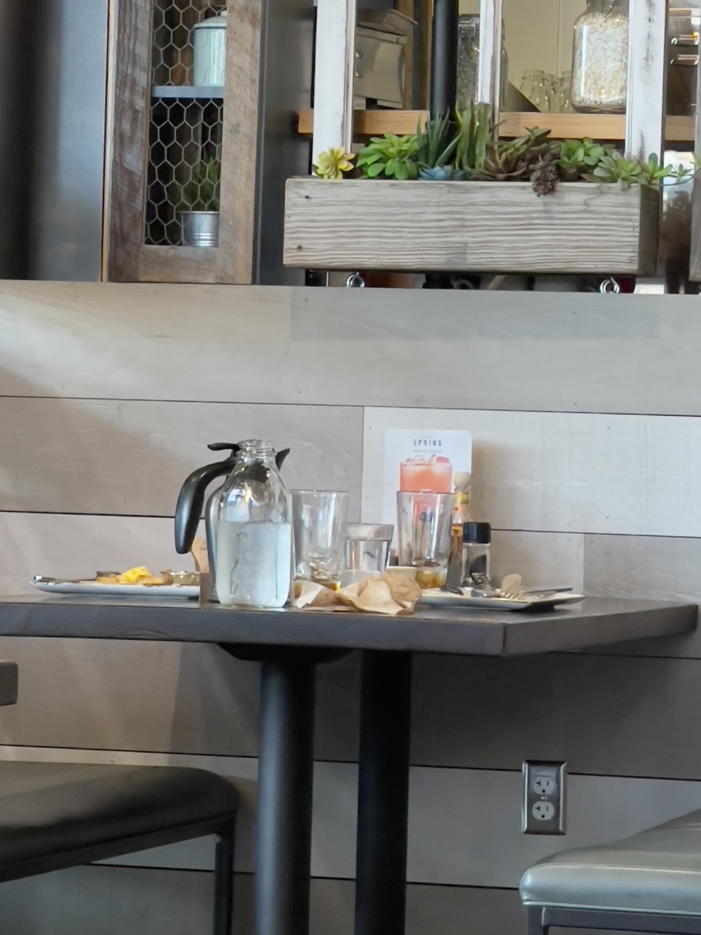Read moreWhere to start.... Well here is the positive, and the only thing keeping you a star in this review. Nick, my server was excellent! Attentive and yet non invasive. It all goes downhill from there. I arrived approximately 7Am. So one of the first few tables in the restaurant. The floors were dirty! Did they get swept the day before? There were crumbs on the chair and table next to me, and it was clearly set for a guest . Crumbs on the chair across from me. One would normally not notice, except the dirty floor had me looking harder. I ordered one of the new menu items (barbecoa burrito) that took an exceptionally longer time than necessary considering I was one of 6 guests in the restaurant. The cooks must still be learning how to plate the item. The lime flavor was almost overpowering at first, but later into the meal ok. Hardly any meat, but plenty of potato. Overall... Ok. Cranberry crush drink, refreshing but really hard to tell if the $1 immunity boost was really in there. At check out, the system needed to be rebooted in order for me too pay, and this happened mid transaction. I had to switch to a different terminal, with my transaction still in progress on the first one. Not a good feeling. Overall... Nick is what is keeping a star in this rexiew. My tab as $18 and some change... I tipped him $20. Lets get this restaurant...