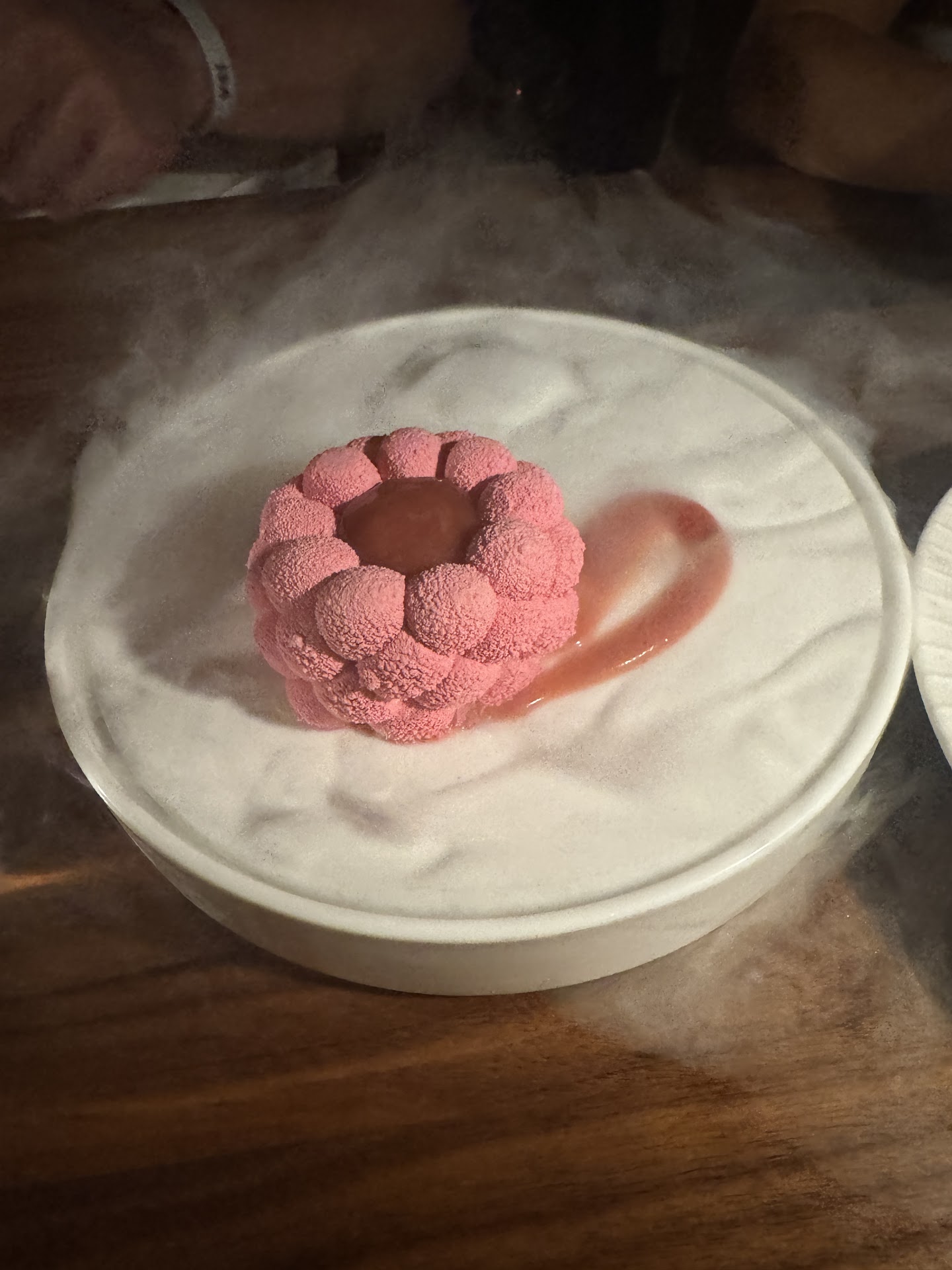 Dessert was the Pink Cloud, which was a berry and lychee mousse "cake". It was served on a ceramic plate with holes in it that rested atop a shallow dish holding dry ice. Our server poured water into one of the holes which created a cloud-like smoke and fun presentation. It was a beautiful and tasty dessert.