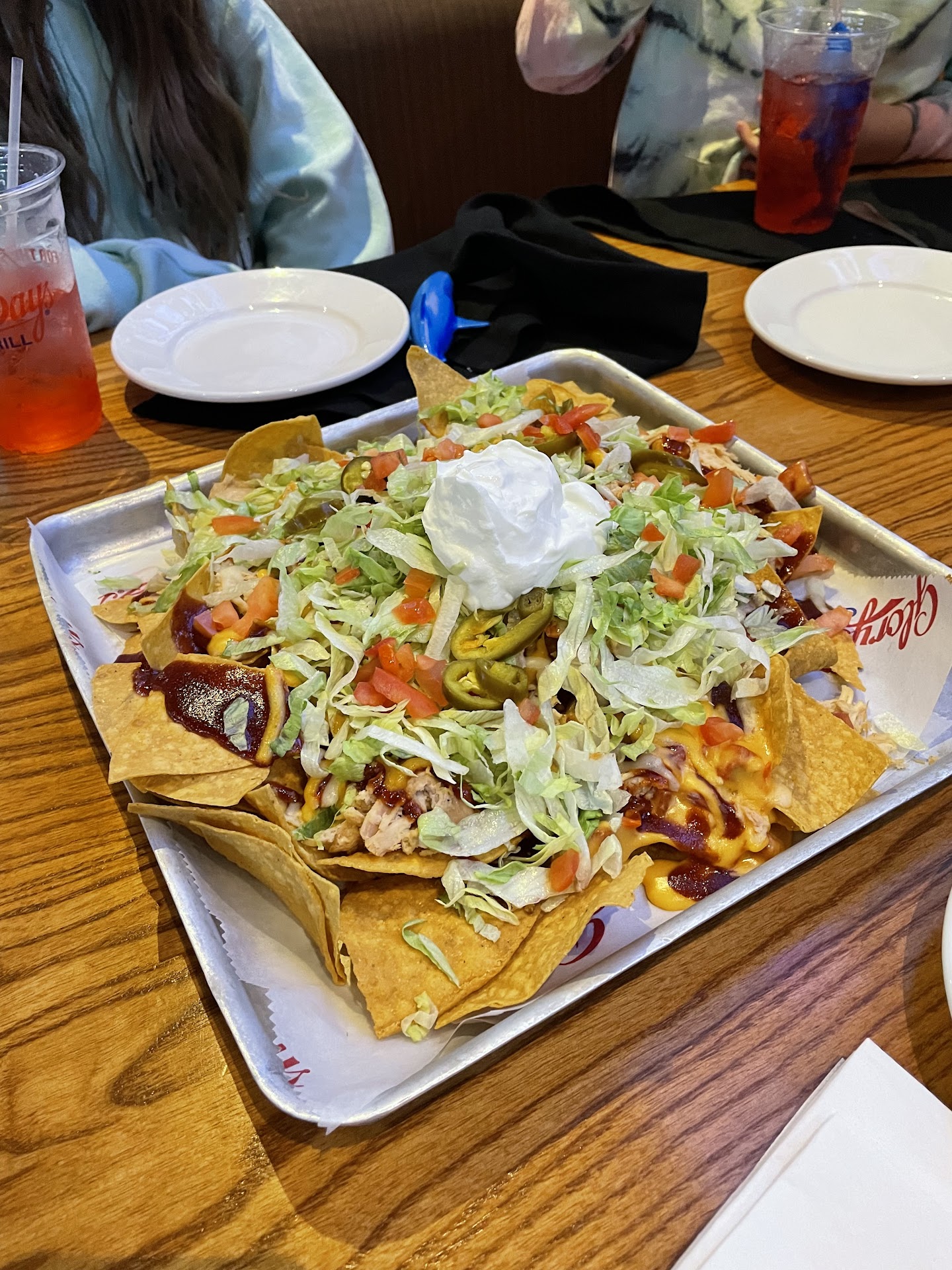 This was my first visit to Glory Days - some friends wanted to go for the Nacho Thursday special, so I tagged along. I'm not a fan of chains, but my first impression was pretty good - how can you go wrong when Bruce Springsteen is playing in the car park? . The restaurant was very clean and very cold (think arctic circle). It was a weeknight, and fairly early, so it wasn't noisy, but the cavernous ceiling might make it bad on a weekend. I don't know if we were seated by a hostess - one of our party was already at a table. Our server came over immediately for our drink order ( usually a good thing, but we later wished we'd had an opportunity to see what looked to be some yummy lemonade mixes on the menu) . My friends opted out of the nachos after having seen them delivered to the table beside us - mostly chips, very little anything else. The menu was predictable and everyone found something that appealed to them, with one exception...me. There were virtually no vegetarian choices, and no vegan options. (Note to staff: Caesar salad is not vegetarian). I get it - sports bar - but there could/should be some alternative options that don't involve asking the kitchen to make special accommodations - particularly in a restaurant where one expects line cooks, not chefs. Our food arrived in a timely manner and most of our party was pleased - the buffalo chx sandwich got great reviews, as did the meatloaf. I had the Mediterranean flatbread appetizer and it was a bit of a disappointment. The presentation was great, but it had that super-tough texture that hints at microwaving, and it had clearly been under the heat lamp while the rest of my party's food was prepped. The edges were singed black and the exposed pesto incinerated. What saved the experience was the staff. Our server, Kayla, was charming and attentive. The food runner was polite and engaged. There was a large party next to us, including kids and an infant , who were quite indecisive and their server managed them with kindness and patience. The restrooms were clean and stocked (don't quite understand the thinking behind playing a tape of a sports event AS LOUDLY AS POSSIBLE in the ladies room, but it was clean, so....) All in all, not a bad experience, but no reason for me to return.