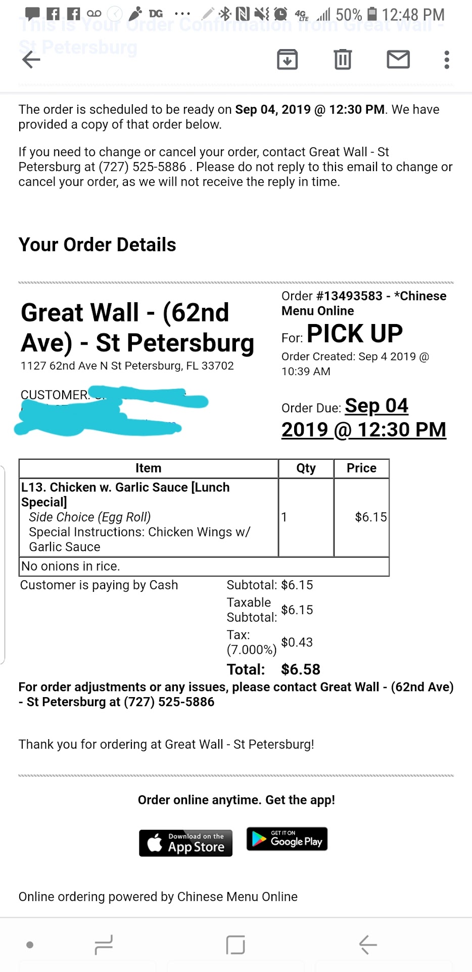Read moreGreat Wall needs better attitudes. They had made a mistake on my order when i clearly placed my order online and its printed out. All i wanted was an order of garlic chicken wings with rice and an egg roll. When ordering online chicken wings werent on the menu so in the special instructions i specified what i wanted so that i didnt get the chicken chunks whether there was an extra cost or not. When i got there she had me down for 2 orders and i told her what the special instructions that she was pointing at meant. She ended up giving me 10 wings and nothing else after i JUST verified i still wanted the rice and egg roll willing to pay for it . But she was so upset at me correcting my order all she kept saying was no no no pointing at the menu telling me the wings dont come with the rice and egg roll , not letting speak to clairfy my order. She then answered the phone and ignored me. I will no longer eat here and i will be disputing the charge with my bank because this is not what i ordered. All she had to do was tell me...