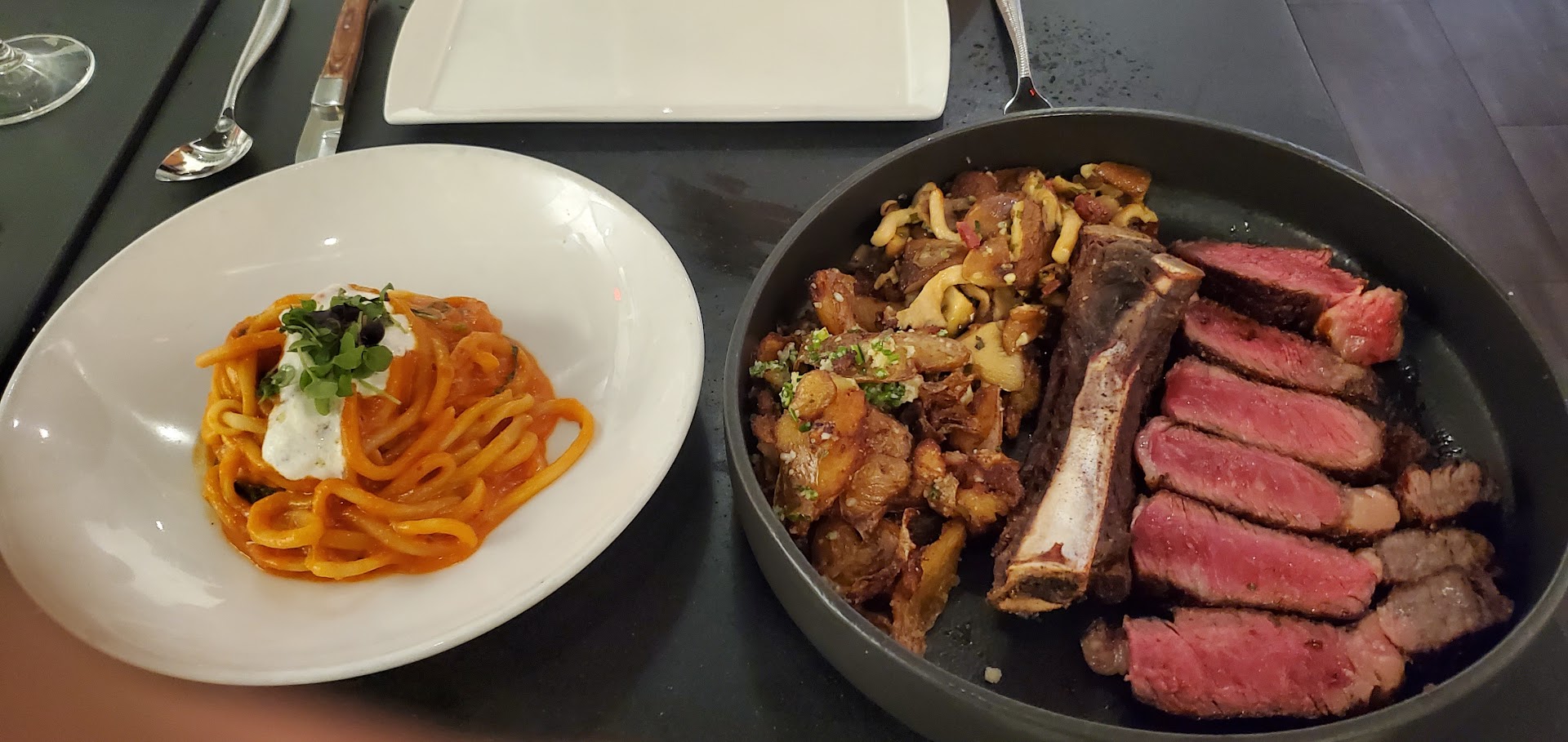 Read moreOur waitress told us twice that the complimentary read would be brought and after almost 40 min after ordering our appetizer, we still had neither the bread or the appetizer. While we saw other parties that came after us had their bread and appetizers. We asked other servers as our waitress hadn’t shown up anymore. Before we had what was the last conversation with the waitress, I asked about what was in a certain entry due to a food sensitivity for too much tomatoes. After 40 min and nothing seems to be changing we asked for the manager and explained what occurred. We got a new waitress who was very nice and she made the experience totally different. But since I already had received information about the entry I planned on ordering, I took it as valid information. How wrong was I. What I got was like spaghetti bolognese minus the meat, so covered in tomato sauce. The appetizer of Octopus was extremely dry. The pumpernickel “salad” looks like maybe like a special dish but at the same time it looks like soil with like 3 small other little things. It tasted ok, but is more like a desert than a salad. Our second waitress really saved the dinner as she was so nice. The manager couldn’t even say “sorry” as that would have been appreciated. The managers excuse was that the computer the waitress put in our appetizer had a delay. Like, complimentary bread was going into the computer. It sounded so bad as sorry I will see how to make it right would have been ok. The parents of the owner sat at the table next to us and got the first server we got. She managed to give them two orders of bread, almost at the same time. That server shouldn’t be in a place like this. I doubt we will go back. The ambiance is nice and busy, so we might have had a very unlucky experience. But for this price and after clearly asking about a dish and what is in, I felt the server gave us the wrong...