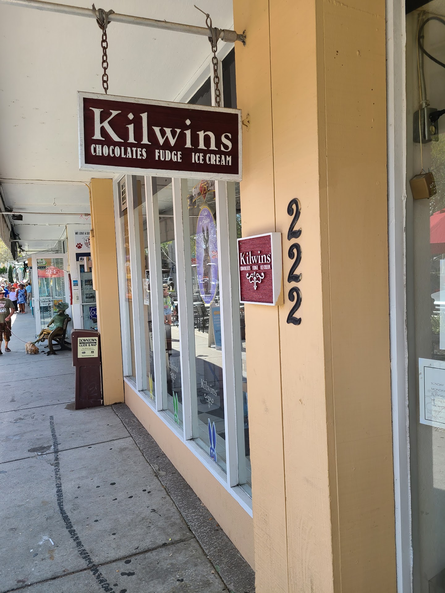 Read moreWe just had lunch in the downtown St. Petersburg and decided we wanted to explore the area and at the same time, look for a desert place nearby. We quickly looked up desert places in Google maps and Kilwins was one of the top indicated dessert places so we then decided to check it out and to our amazement, it was really close by..455 feet to be exact. We started to walk and saw the Museum of Fine Arts across the street and a glimpse of St. Pete's pier in the distance. We also passed a few restaurants that were initially on our list of places to try. We almost past Kilwins if not for the elephant statue in a green cap and shorts lounging on a bench in front of the dessert place. Hmm..that would be a perfect landmark as the Kilwins sign isn't that noticeable if you are walking. We entered the store and wow, it was sweets galore. ice cream of all kinds, so many choices of chocolate..truffles, caramel, confections, peanut butter cups, caramel apples, fudge..woah a lot of fudge. Luckily, we had already decided beforehand that we wanted ice cream and they had a waffle cup which was perfect so we could pick and choose a few flavors. We went with salty caramel, strawberry chunks and fudge brownie. The serving was huge that my wife decided to share the ice cream delight with me instead. We got our ice cream and quickly crossed the street to see the pier and the other surroundings. It also started to get warm so the ice cream was a welcome treat. And the ice cream was so good, creamy and perfect. The waffle cone held up well, well maybe too well and was afraid it would break if I wanted a piece. The nice thing is that the ice cream was not too sweet. My wife quickly looked for a spot for me to take a video of her eating the scrumptious ice cream. Kilwins is definitely worth checking out for a nice snack/dessert. Ice cream is just one of many choices that you can get and you mist certainly will get confused on what to get as everything looks so good and the store has a fun display and...
