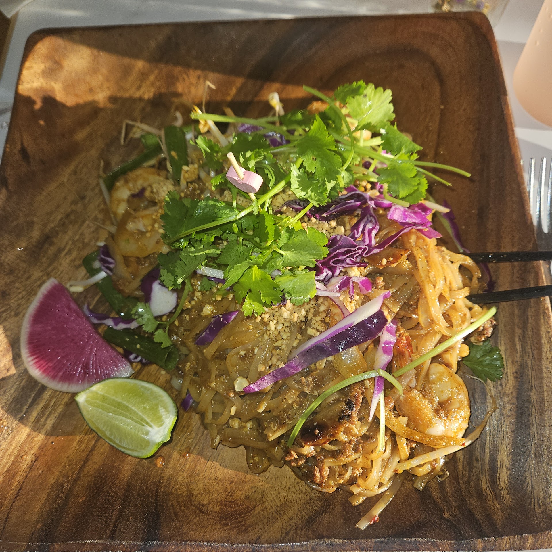 Read moreThis is the second time we've ate here. The first time was amazing, 5 stars for sure. The first time I ate the Chorizo Pad Thai. This second time, my wife and I came on a Friday night. We ordered the Tom Kha soup, Lettuce Wraps, Wings, and Chorizo Pad Thai again. The time to receive both our drinks and food was quite long, but it came in stages, so not terrible if we were able to get drink refills without having to get up and go back to the cashier each time. The lettuce wraps, while tasted fine, were impossible to eat in the desired intent. You couldn't pick up a wrap as there were 3 leafs of a greenleaf lettuce for approximately a pound and a half of filling. Like, is it a salad, or wrap? I don't even know what the intent here, but there is no way to eat these things as a wrap. The wings tasted good, had the sweet pineapple flavor, but the skin was limp, like they were steamed. I would say the good flavor outweighs the soggy skin. The Tom Kha soup was terrible and this is what stimulated the review. Overall the flavor was oddly sweet, IF! you could make it through the patch of unedible food. The bowl was littered with chunks of ginger, cinnamon, lemongrass, some leaf I couldn't identify that reminded me of bay leaf. The shrimp were SEVERLY overcooked, like had a microwaved texture. The soup was served in the same dish my wife's pad thai was served in, a giant square bowl. I complained to one girl who brought the drinks out and thought she was getting a manager. ... Then, I find out the people next to me have a daughter that works there and overheard a conversation they had together about my experience and heard the worker say "I would tell you to never order that..." referring to the Tom Kha soup. I even asked her when I ordered which soup was better, and she responded with "Tom Kha". If the Tom Kha soup is that bad, I can't imagine how bad the other soup is. Basically, after all was said and done, 2 employees there both understood how bad I thought the soup was, yet no visit from a chef or manager ever came.