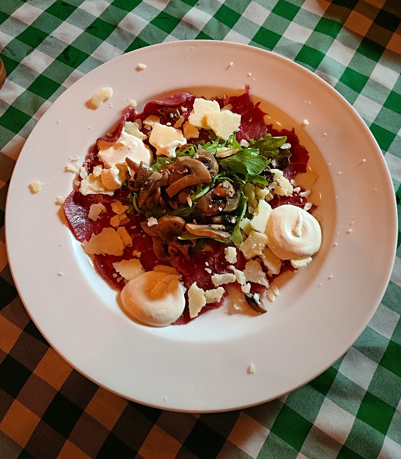 For appetizers, we tried Carpaccio and Formaggio e Pane. Carpaccio was excellent - super thin slices of beef, balsamic-marinated mushrooms and a few dollops of truffle & black pepper aioli and thin shaves of parmigiano/reggiano cheese. The aioli makes the dish; it's much better than the squeeze of lemon juice which is the usual garnish for carpaccio.