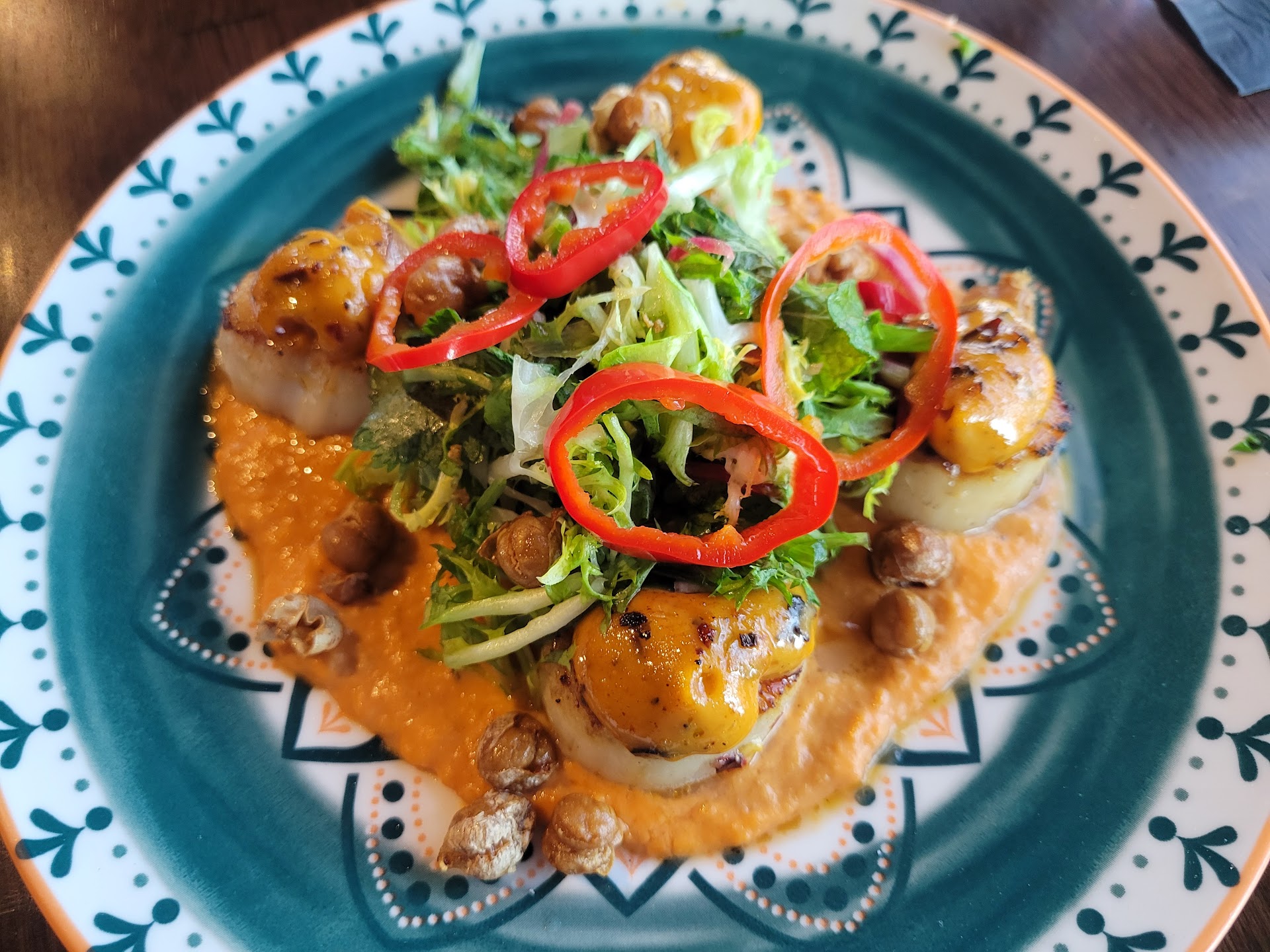 We asked about preparations, gluten intolenerances, flavor profiles et cetera. I ordered the scallops. My guests ordered the chefs catch of the day, a black grouper dish atop a black bean puree. Nowhere did the server say sweet in her explaination.