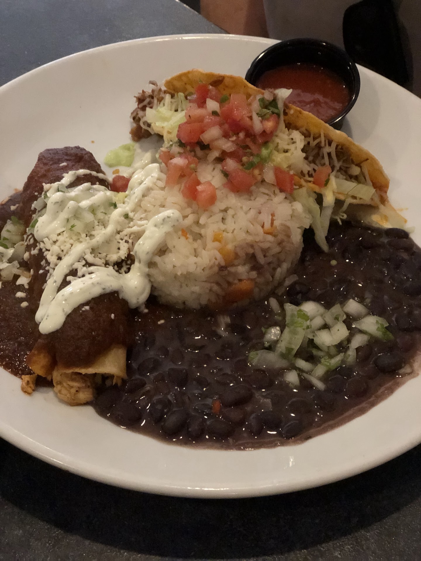 My girlfriend ordered a taco salad with ground beef, something she gets at most Mexican restaurants due to her dairy allergy. She said the ground beef had next to no flavor at all & the taco shell for the bowl became really soggy really quickly. The fact that they charge $13 for the salad bowl & upcharge you another $7 just for flavorless ground beef makes it absolutely not worth it! We understand upcharging for certain proteins, but every other restaurant we've gone to that has this on the menu gives you the choice of at least either chicken or ground beef for no extra cost. I ordered the chicken enchilada, & when I say the portion size was small, I mean I was done with my meal before my girlfriend even started hers. The serving size was 1 small enchilada, maybe 4 or 5 inches long. The chicken was cooked all the way, but yet again, it had barely any flavor, and the tortilla they used for the enchilada was a bit overcooked. I had ordered the cilantro lime rice with it, but it tasted like plain jasmine rice, which was really disappointing because I love cilantro lime rice.